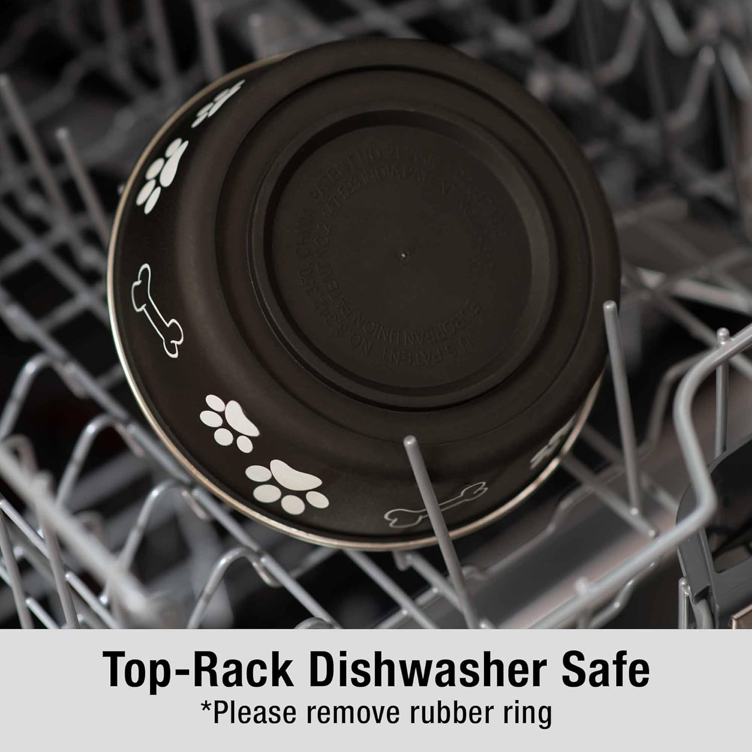 - Veterinarian recommended stainless steel interior. Removable soy-based rubber ring prevents spills and reduces noise. Dishwasher safe; remove rubber ring before washing. Available in five colors and 4 sizes to fit any decor1-Pint bowl