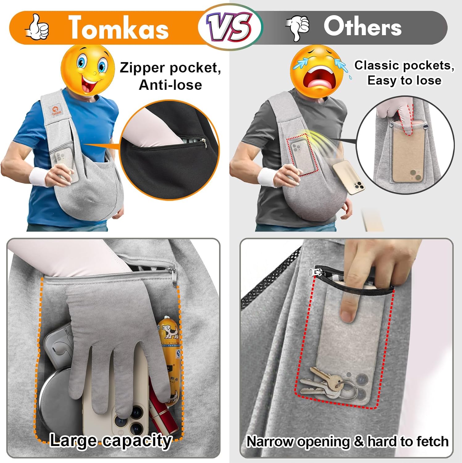 - Large-Capacity Zippered Pockets: Stay organized with Tomkas's front zippered pocket that can store all of your essentials, such as your phone, keys, cards, wallet, and dog leash. Our reliable carrier is designed with your convenience in mind. Unlike other dog slings without zippered pockets, our pocket keeps your belongings secure throughout use.
