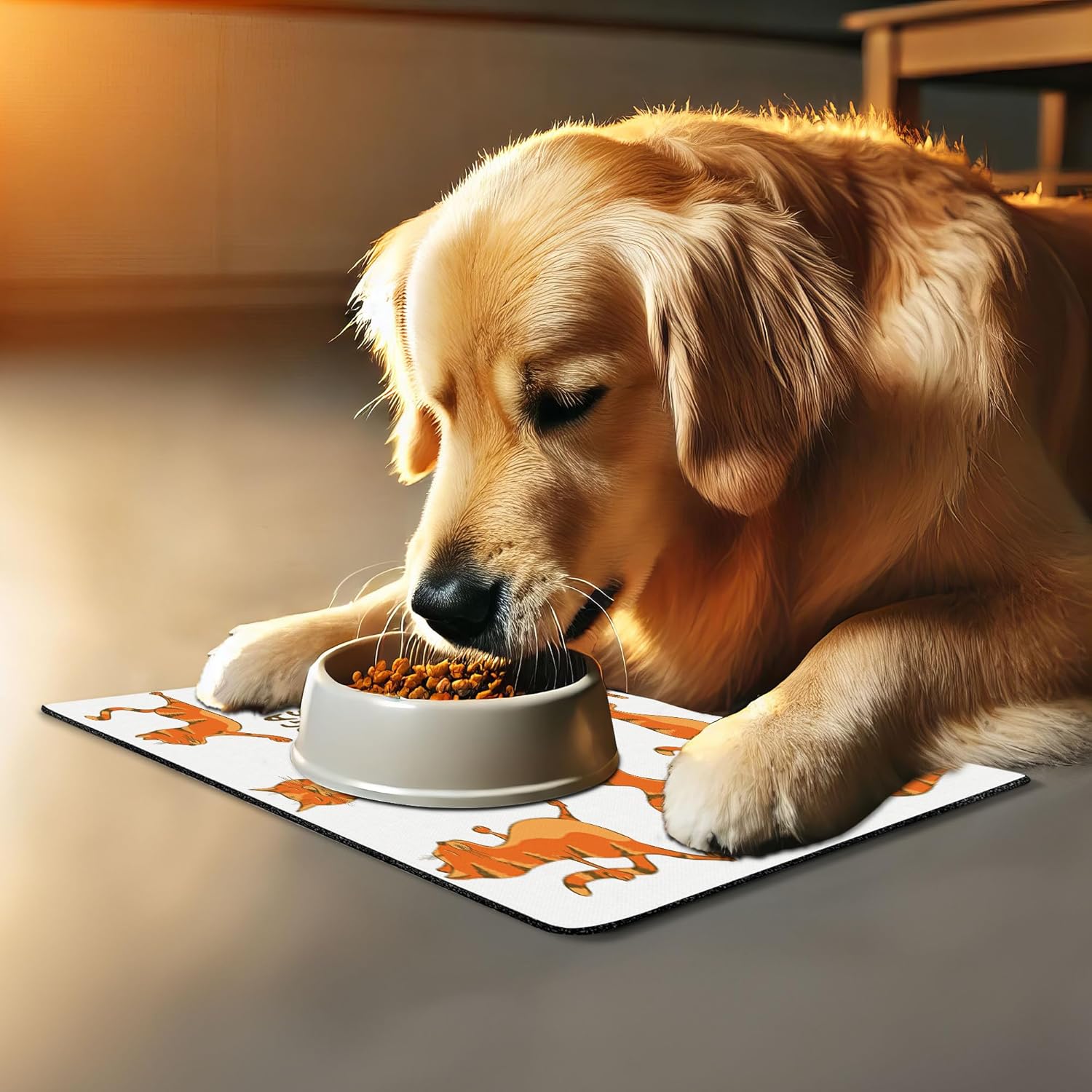 - Features - Fun prints and long-lasting colors. Find any theme and color you want to match your room decor or your pet’s personality. This pet feeding mat can even feature your cat's or dog’s favorite item or design, adding a cheerful touch to your pet’s feeding area.