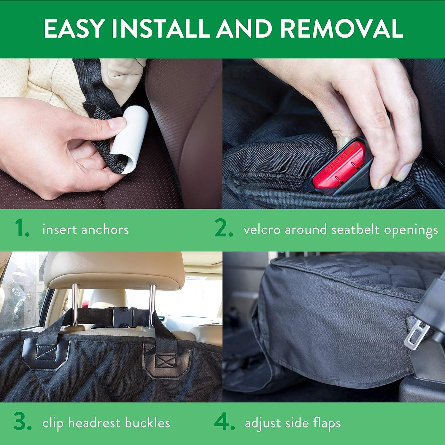 - ššš¦š¬ š§š¢ šš”š¦š§ššš: This back seat car cover comes in various sizes, REGULAR - 55''W X 60''L / EXTRA LARGE - 63''W X 68''L / BOTH HAVE - 9'' X 18'' SIDE FLAPS. This elastic skirt and adjustable back and headrest straps provide a seamless clean look and snug fit. Buckle the dog car seat protector to your back seat using the adjustable back strap and insert the seat anchors to secure the cover in place. The headrest strap fits most vehicles