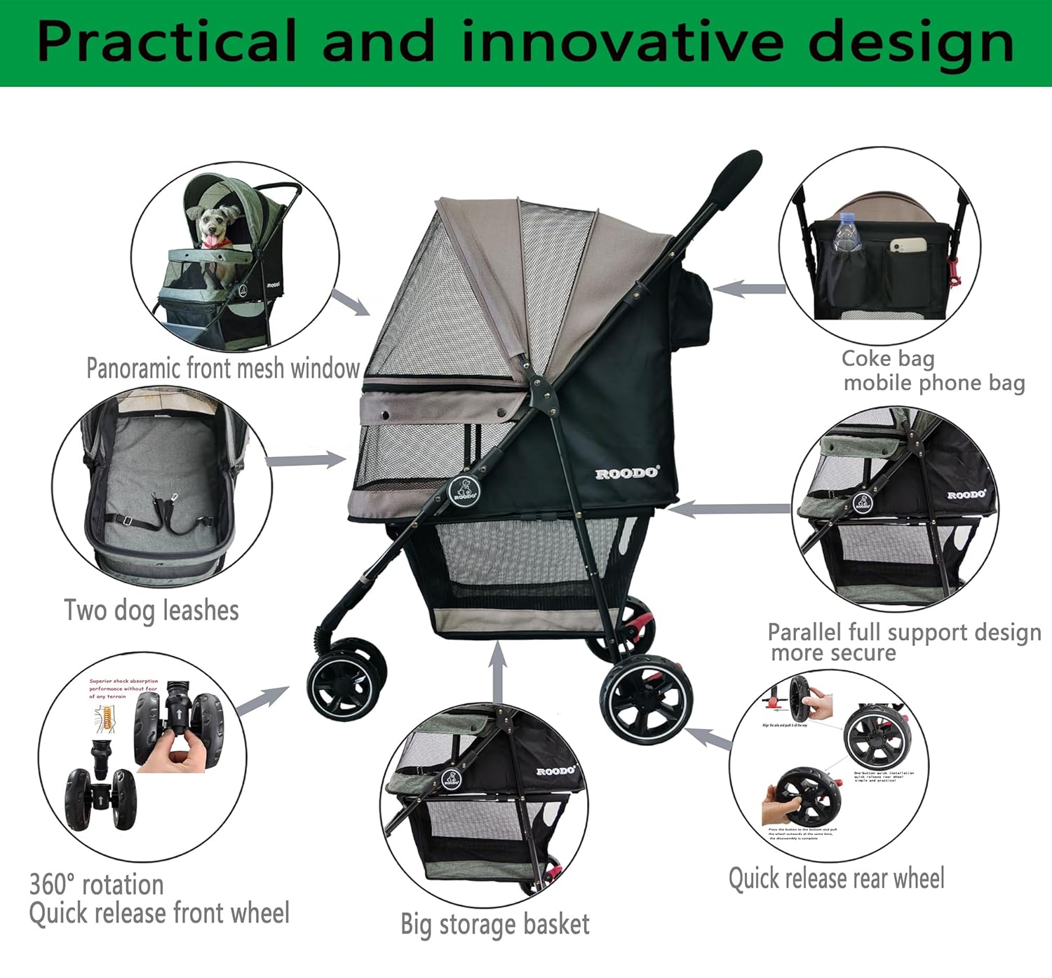 - ROODO Escort 3 Wheel Pet Stroller,have been upgraded front wheel and rear wheels can be quickly installed and removed without tools,The installation of the front and rear wheels will be easier and fasterγ