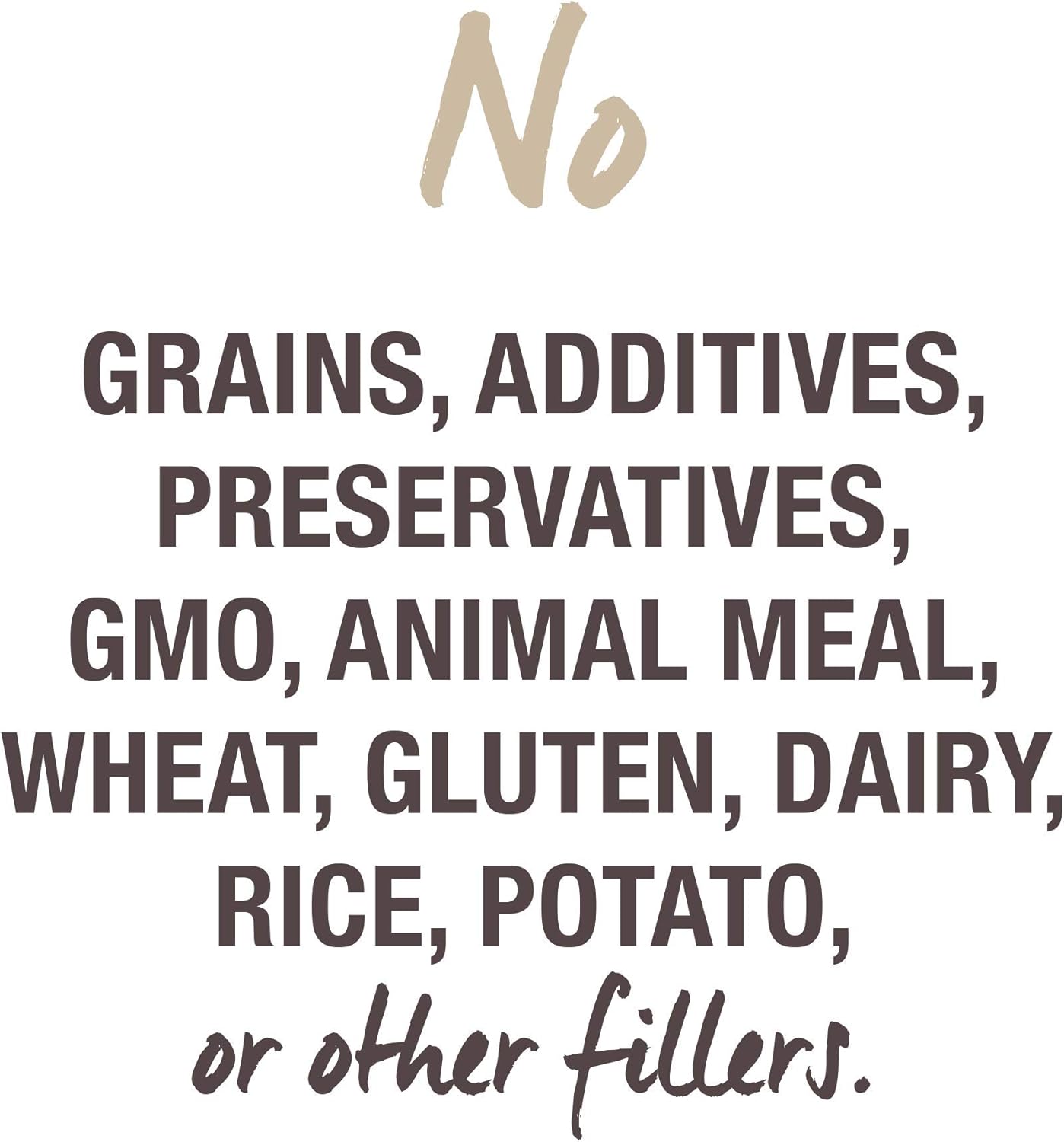 - Made without grain, wheat, gluten, GMO, ingredients, corn, soy, cereals, dairy, dairy, rice, potato and all other fillers