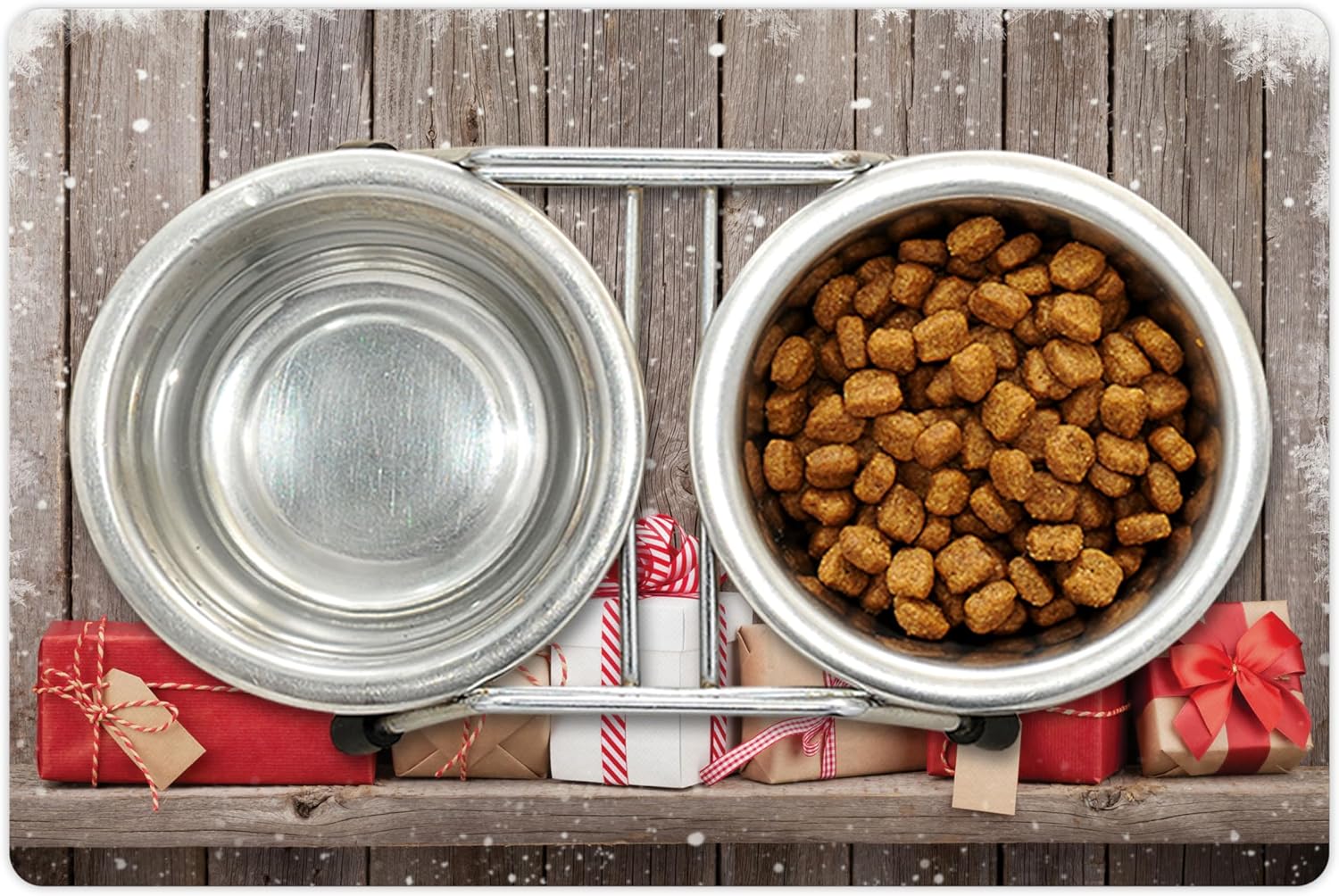 Lunarable Christmas Pet Mat for Food and Water, Concept Photo with Present Boxes Front of Wooden Wall and Snowflake Frame, Non-Slip Rubber Mat for Dogs and Cats, 18" X 12", Burgundy Grey