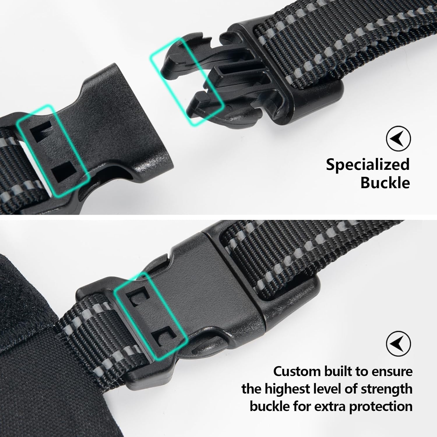 - [UPDATED VESION, EASY TO PUT ON & TAKE OFF] This dog harness has 3 snap buckles( One is on the neck, two are on the chest), NO NEED go through dog’s head. This will let your dog loves to wear harness!