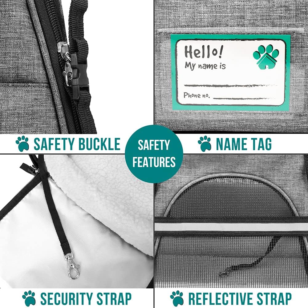 - AIRLINE APPROVED CAT CARRIER: Airline compliant and fits under most airplane seats, this tsa approved pet carrier is easy to carry on in different ways. Besides top handle strap and a removable shoulder strap, the pet travel bag is equipped with side buckles for car seat belt loops. Comes with an identification name tag, and a zipper pocket on the front to store pet stuff, treat, food, toy, or personal items, phone and cards, this soft cat taxi is the most convenient carrier for travels.