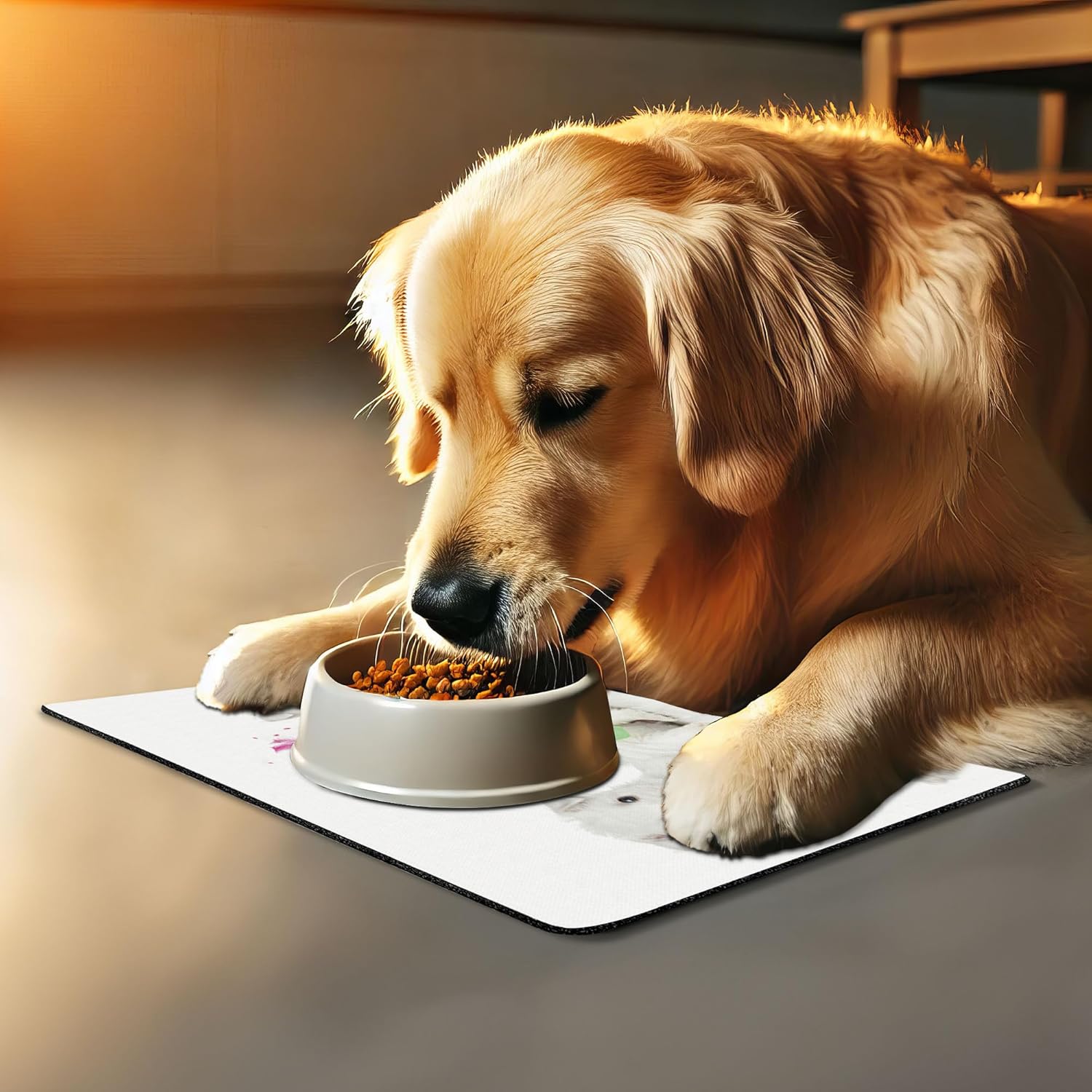- Features - Fun prints and long-lasting colors. Find any theme and color you want to match your room decor or your pet’s personality. This pet feeding mat can even feature your cat's or dog’s favorite item or design, adding a cheerful touch to your pet’s feeding area.
