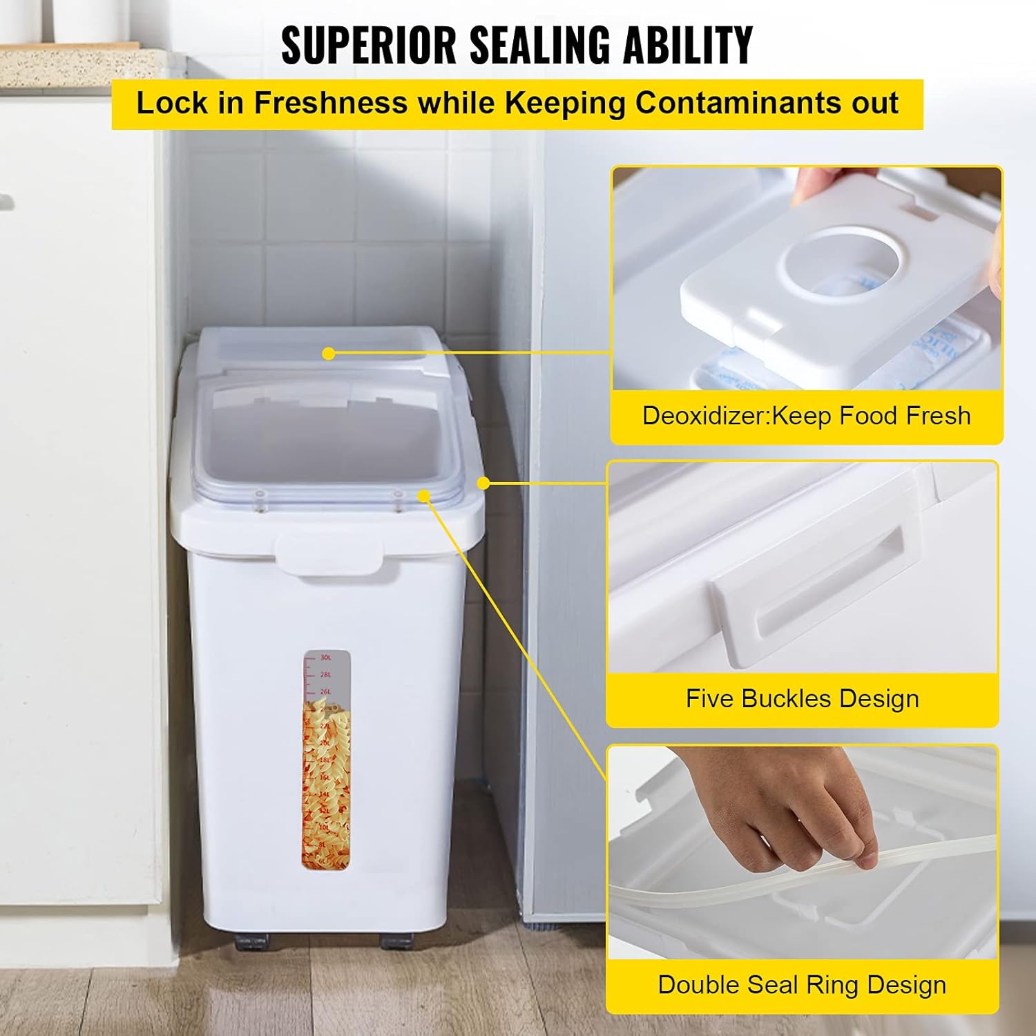 - High-quality: The highlight of this product is that the rice bin has a transparent window and scale, which allows us to observe the allowance in the barrel and replenish it in time. At the same time, designed with high-quality food-grade PP and PET material, this commercial flour bin is convenient to store food and will not easily be contaminated. Furthermore, it is made of thickened 3 mm wall, which provides strength and durability.