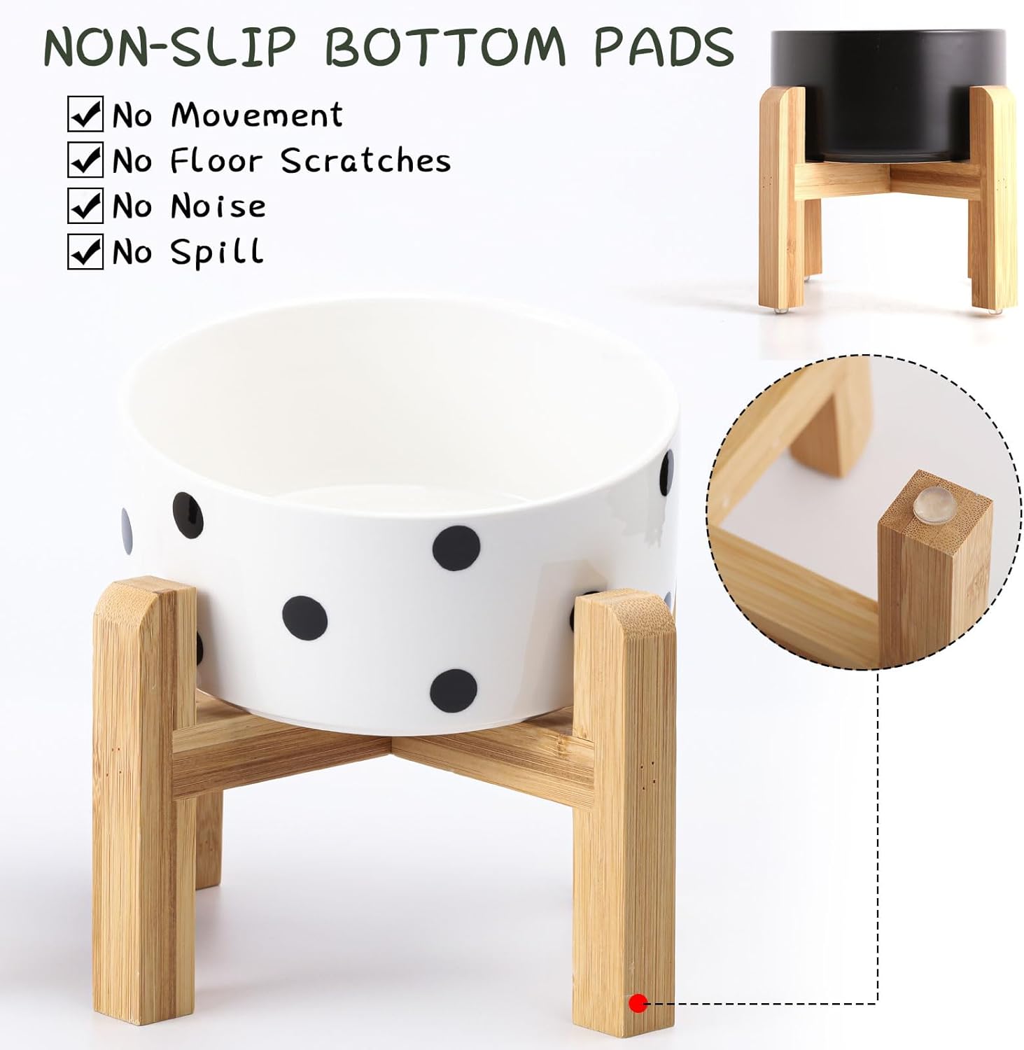 - NON SLIP WOOD STAND -You can get two different heights by flipping the bamboo stand,the elevated cat bowls are perfect for cats and small size dogs from different stages of childhood to adulthood, The wood stand on the bowls stopping ceramic cat dog bowl from sliding around, Keeps pet food and water in the bowls.