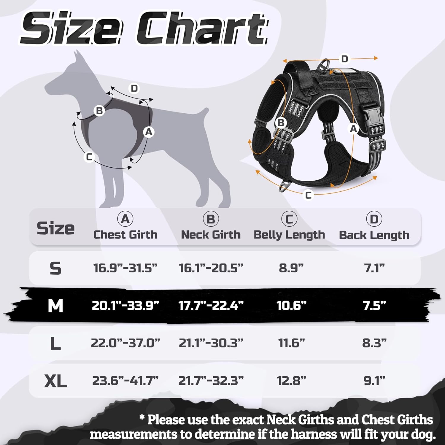 - Medium Tactical Dog Harness: Chest Girth: 20.1"-33.9" (51-86cm), Neck Girth: 17.7"-22.4" (45-57cm), Belly Length: 10.6" (27cm), Back Length: 7.5" (19cm). Ideal for Pitpull, Boxer, Cane Corso, Labradoodle, Australian Shepherd, Corgi, Bull Terrier, Cairn Terrier, etc