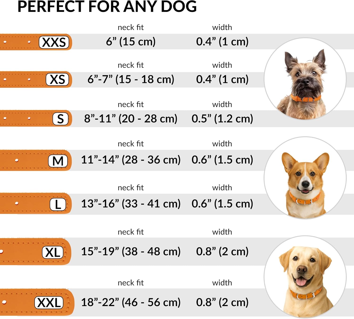 - SUITABLE FOR ALL BREEDS: Our dog collars for small dogs and big dogs come in a variety of sizes. Please check out our size chart before purchasing a leather collar for dogs. The dog collar leather is 0.4 inches wide, 8 inches long, and neck sizes of less than 6 inches.