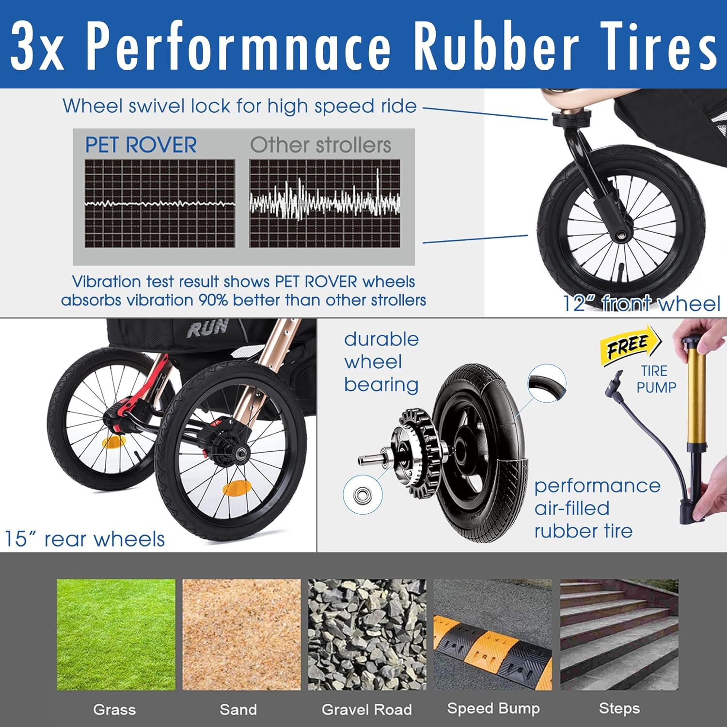 - 3X PERFORMACE RUBBER WHEELS ★ All three durable and durable automotive-grade air filled rubber tires offer excellent stability and superior ride quality for speedy travel on all terrains. Highly maneuverable front swivel wheel with swivel locks of the front wheel enhances stability even on rough terrains. The oversized rear wheels add comfort and stability for jogging and running. A free tire pump is included