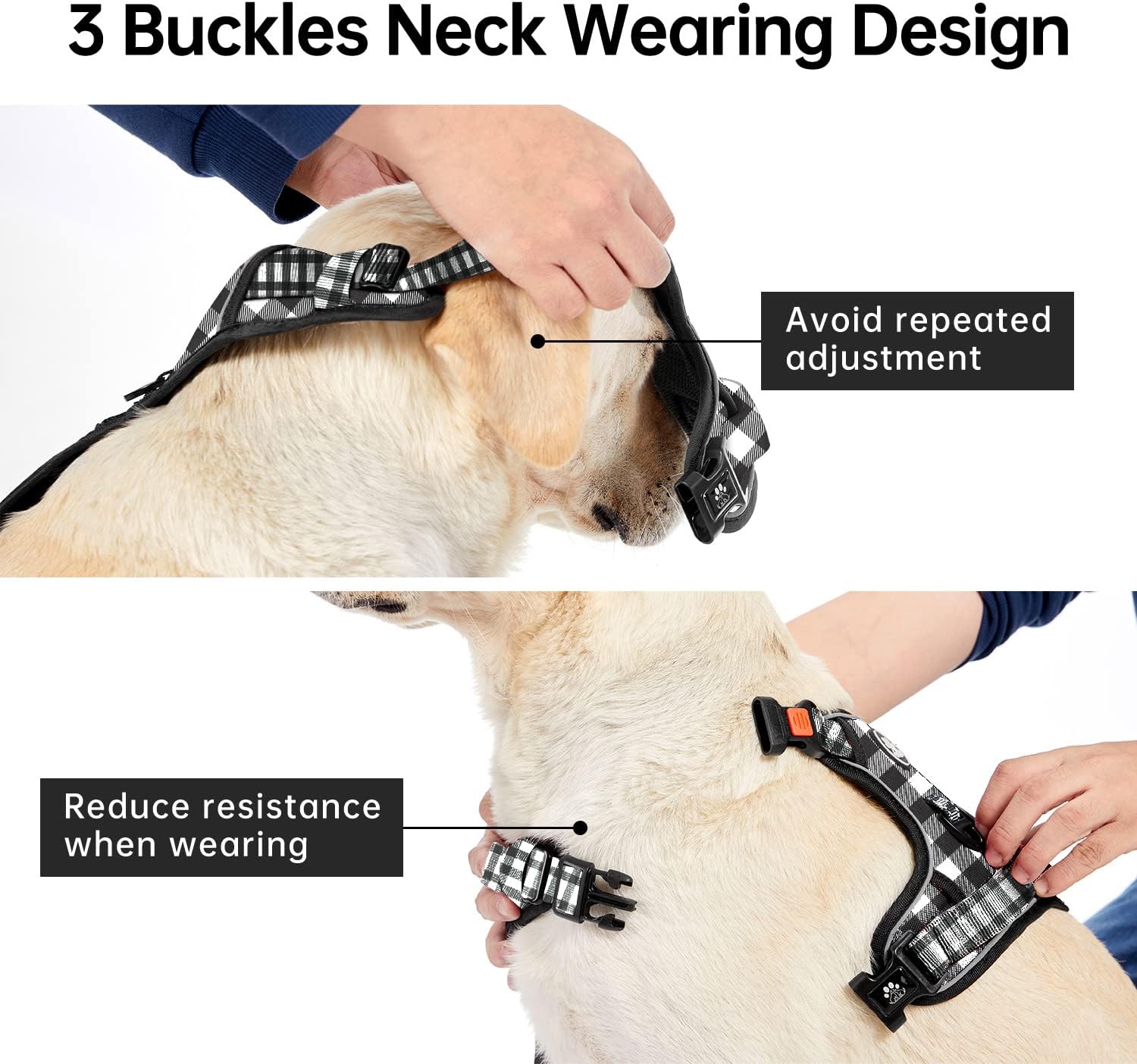 - ≡ EASY TO PUT ON & TAKE OFF ≡ The upgrade no pull dog harness is equipped with 3 buckles on both neck and body position, so you can easily put it on or take it off from the neck side. No more time and effort to put on the harness from the dog's head, and no more worries about hurting your restless dog during the process