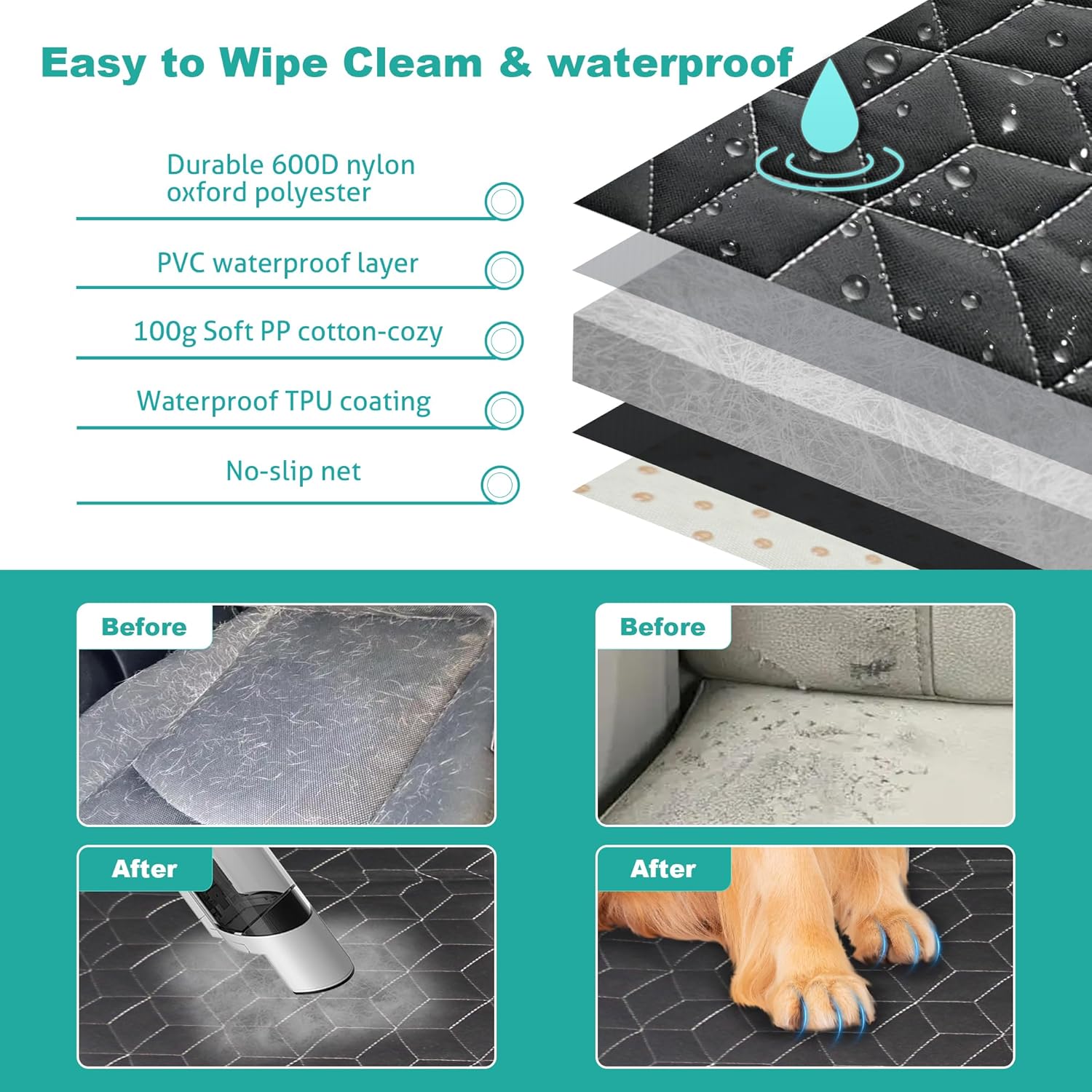 - PROTECT TRUCK INTERIOR: Our pet seat cover is made of 600D Oxford fabric, 100g PP cotton, 210D polyester fabric, and 100% waterproof TPU. The durable material prevents your dog from scratching the car seats. Installing the back seat pet cover for dogs can prevent pet hair from getting into the seat crevices while also protecting the car interior from pet urine damage