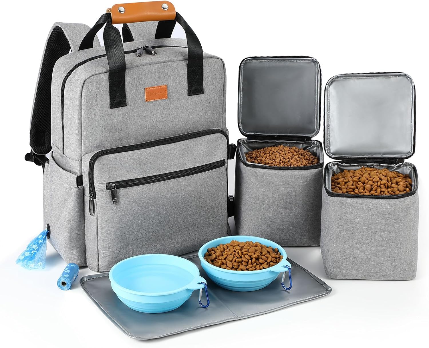 Dog Travel Bag, 25L Airline Approved Dog Travel Backpack for Pet Travel Accessories with 2 Food Storage Containers, 2 Foldable Bowls for Short Trips, Grey
