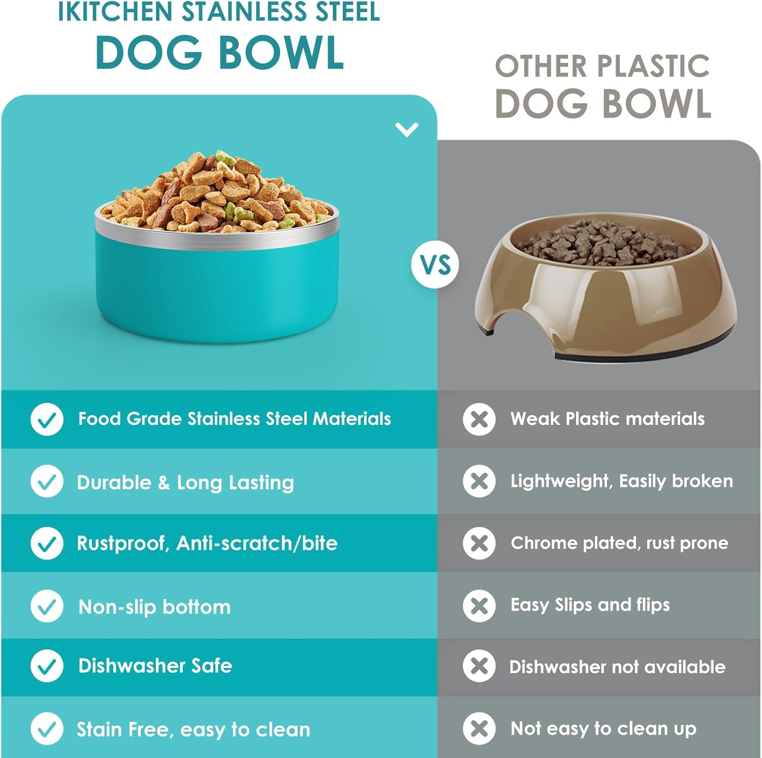 - STAINLESS STEEL DOG BOWLS-Our food and water bowls for dogs are made of double wall insulation and 304 food grade stainless steel, which is super long lasting, rustproof, scratchproof, environmental friendly. The outside of our non-slip dog bowls are made of Acrylonitrile Butadiene Styrene (ABS) for more durability.