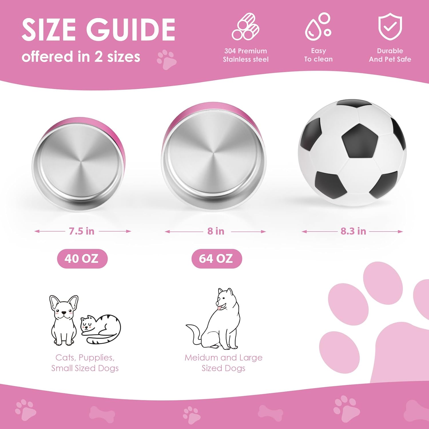- 40OZ AND 64OZ HEAVY LARGE DOG BOWL-The insulated dog bowls have 40 oz or 64oz for your choice. The dimension of 40oz dog bowl is 7.5" x 7.5" x 2.9" (19.05cm x 19.05cm x 7.3cm) Another size of 60oz dog bowls is 8" x 8" x 3.5"(20.32cm x 20.32cm x 8.89cm) Our no spill water bowl for dogs holds enough food and water to allow your pet to have a hearty meal. Great for puppy, medium, large and extra-large size dogs, cats and other animals.