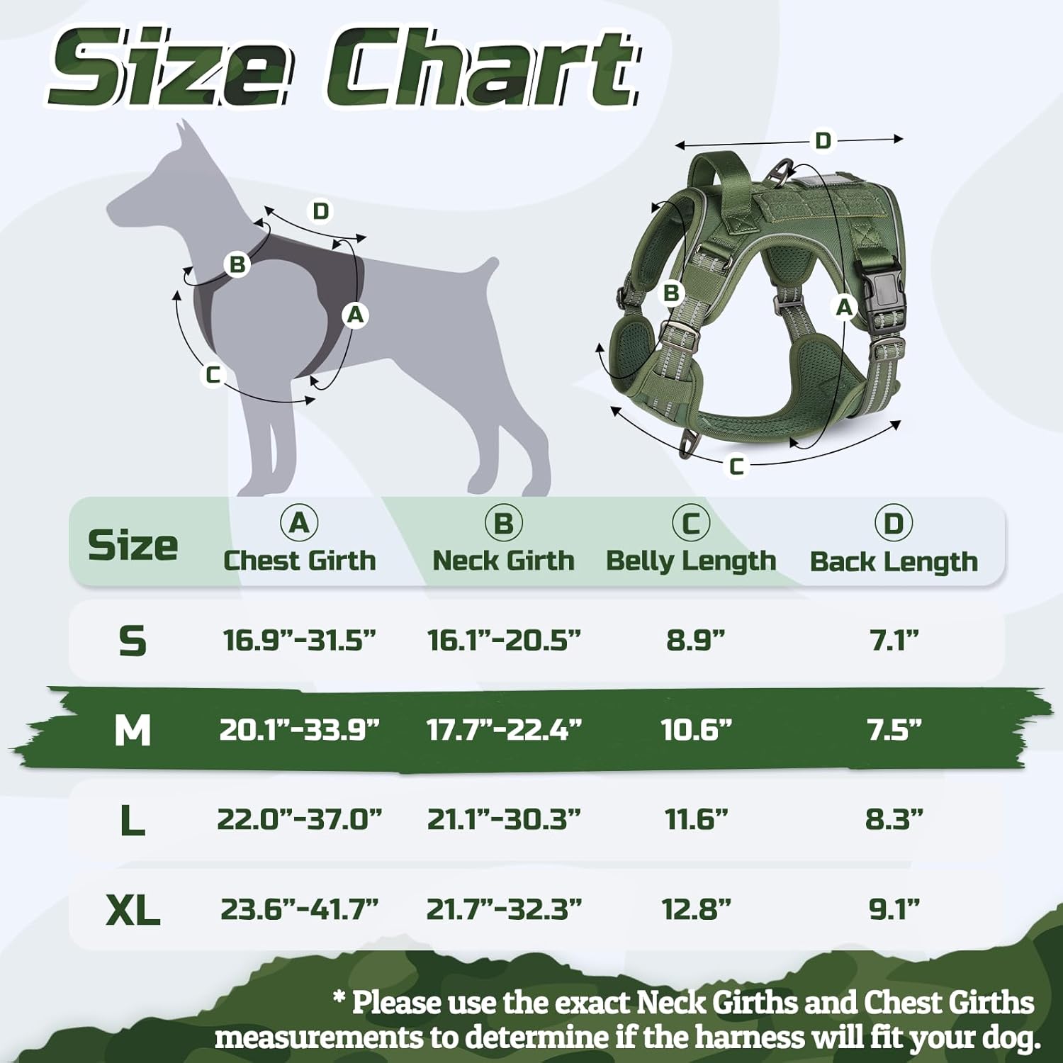 - Medium Tactical Dog Harness: Chest Girth: 20.1"-33.9" (51-86cm), Neck Girth: 17.7"-22.4" (45-57cm), Belly Length: 10.6" (27cm), Back Length: 7.5" (19cm). Ideal for Pitpull, Boxer, Cane Corso, Labradoodle, Australian Shepherd, Corgi, Bull Terrier, Cairn Terrier, etc