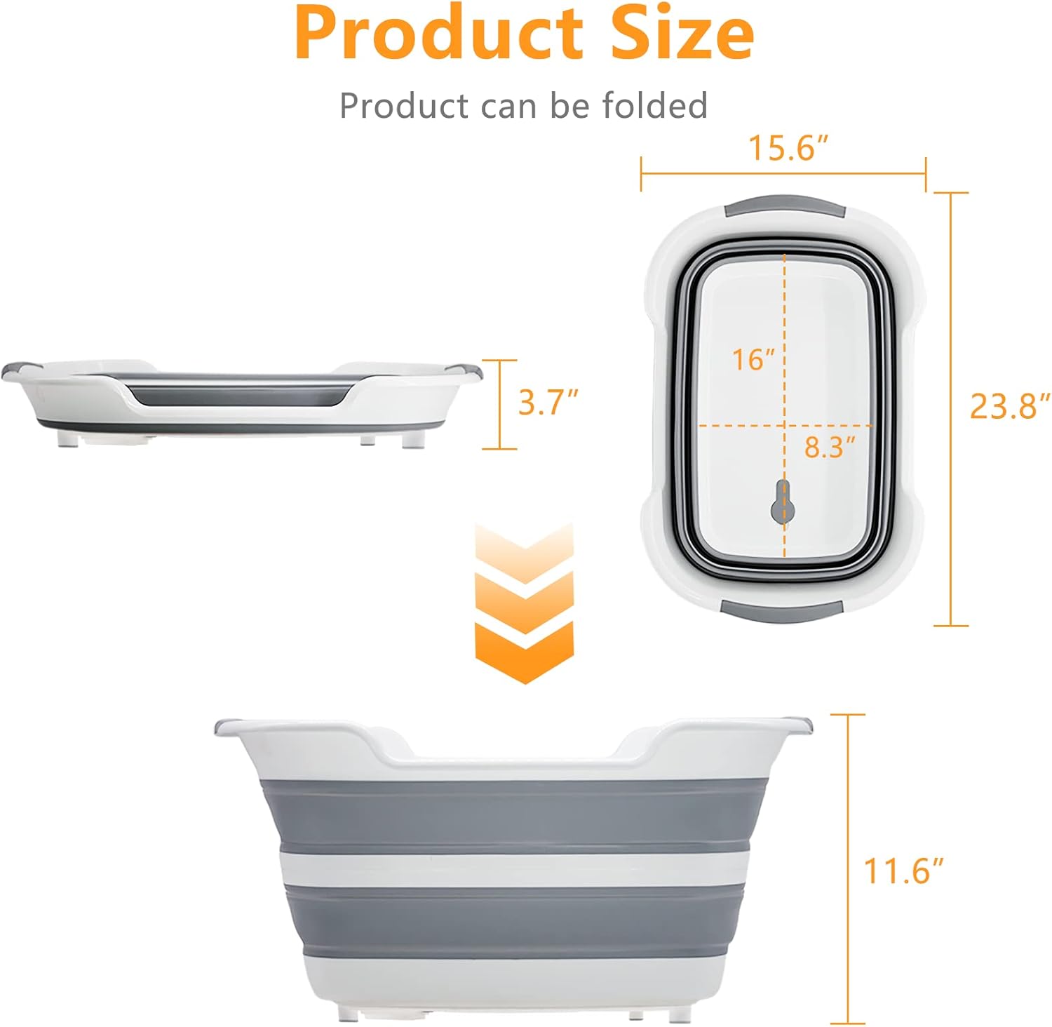 - 【Space-Saving and Foldable】The collapsible bathtub is made of flexible thermoplastic rubber (TPE) + premium PP material. Expanded size:23.8 x 15.6 x 11.6(h) inches.Collapsed:3.7 inches. The exterior bottom dimension is about 16 x 8.3 inches. Capacity: 27 L / 7.1 gallons