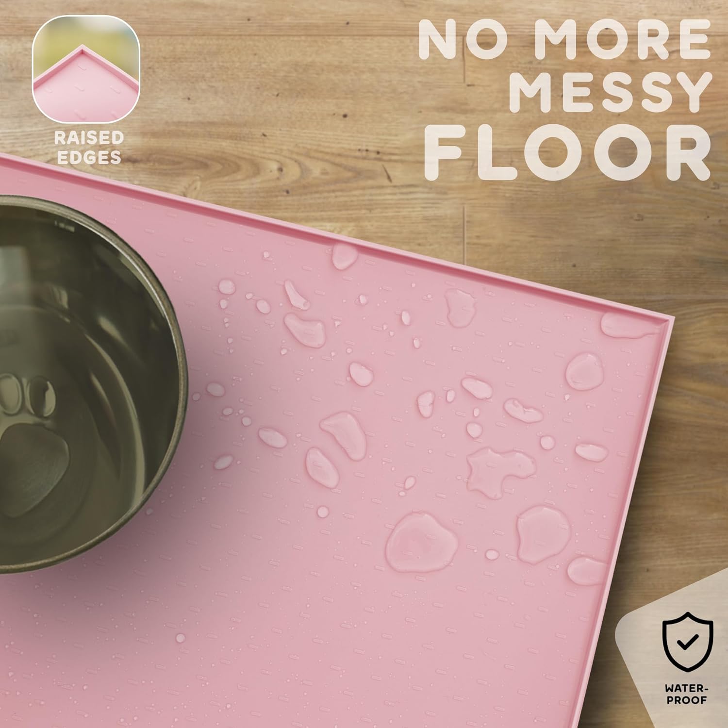 - RAISED EDGES KEEP THE MESSES WHERE IT BELONGS: Keep Your Home Spotless & Enjoy Hassle-Free Dinnertime with Your Furry Friend! Whether they eat with enthusiasm or like to play with their food, our 24"x15" dog food mats for floors waterproof are specially designed to reduce cleanup time for both wet and dry foods. Treat yourself and your furry pal to a cleaner, more enjoyable mealtime experience.