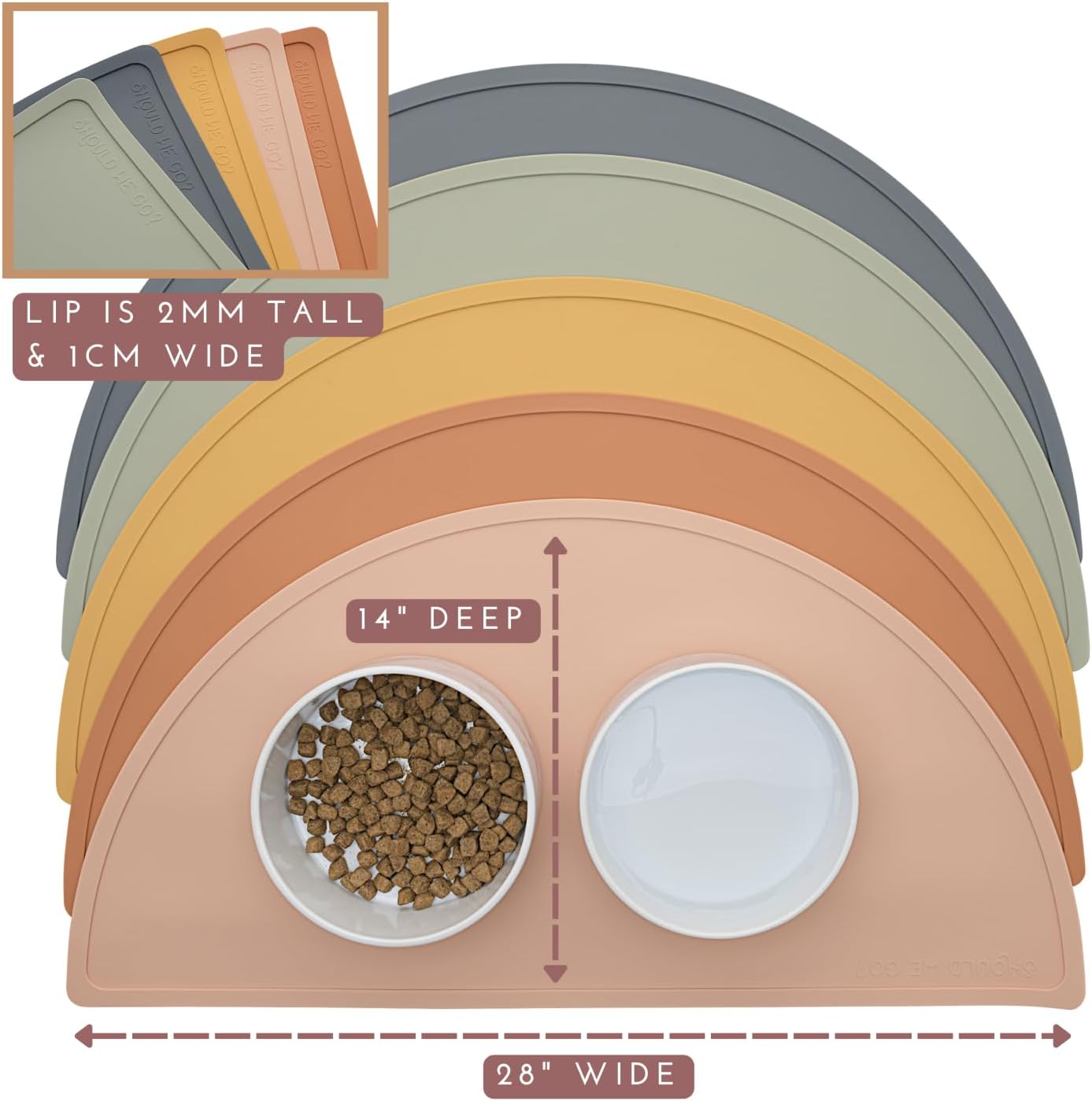 - CONTROL SPILLS AND MESSES: Our silicone pet food mat with a raised edge helps keep spills and messes on the mat. The large size mat is 28" across x 14" deep. It works with bowls that are 10" across or smaller. The lip is .2" tall and .4" wide.