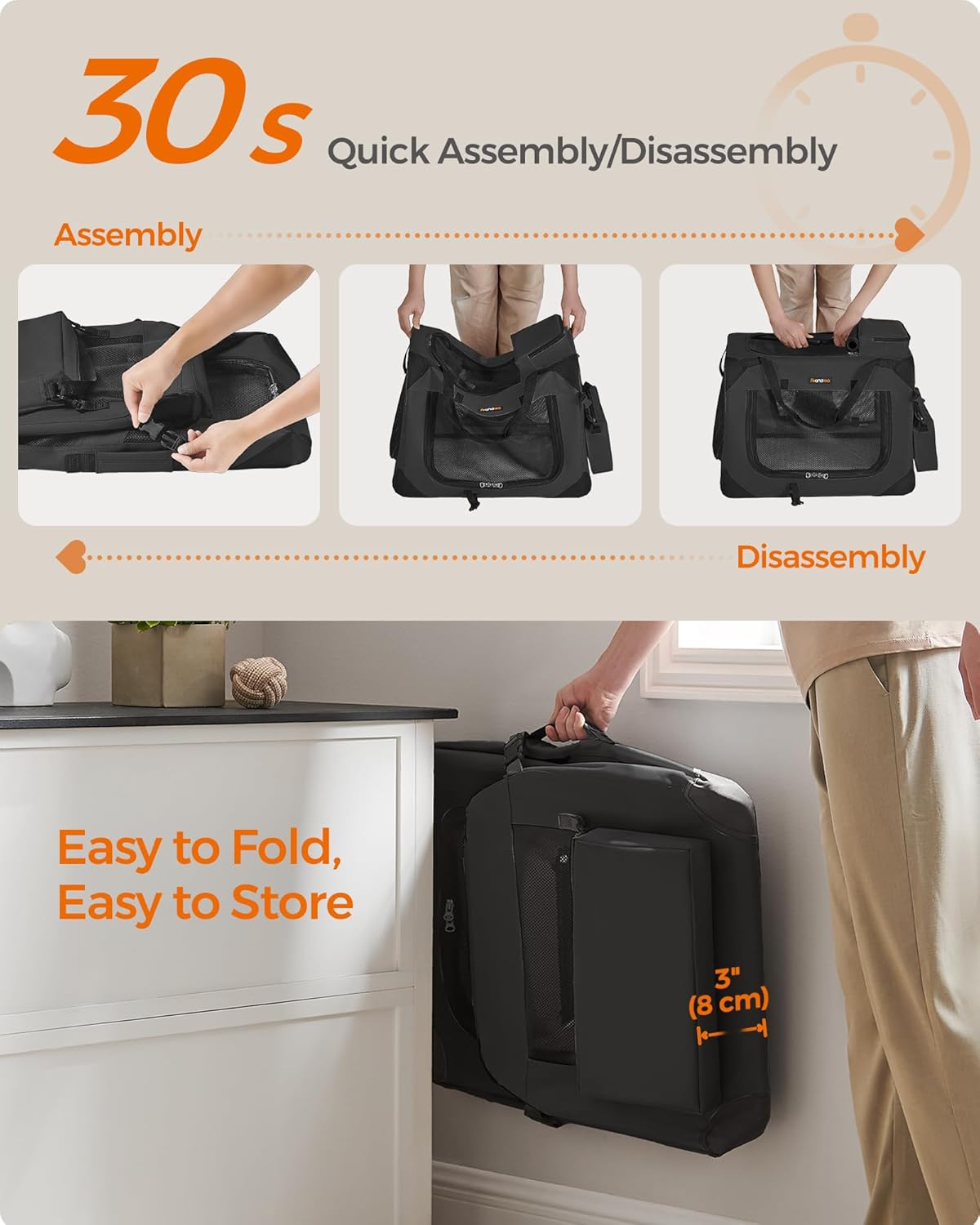 - 【QUICK ASSEMBLY & EASY FOLDING】The dog crate can be assembled in 30 seconds without tools and can be stored in the car or in the corner of your home after folding. It can be easily carried for indoor use or traveling, giving your dog a warm home anytime