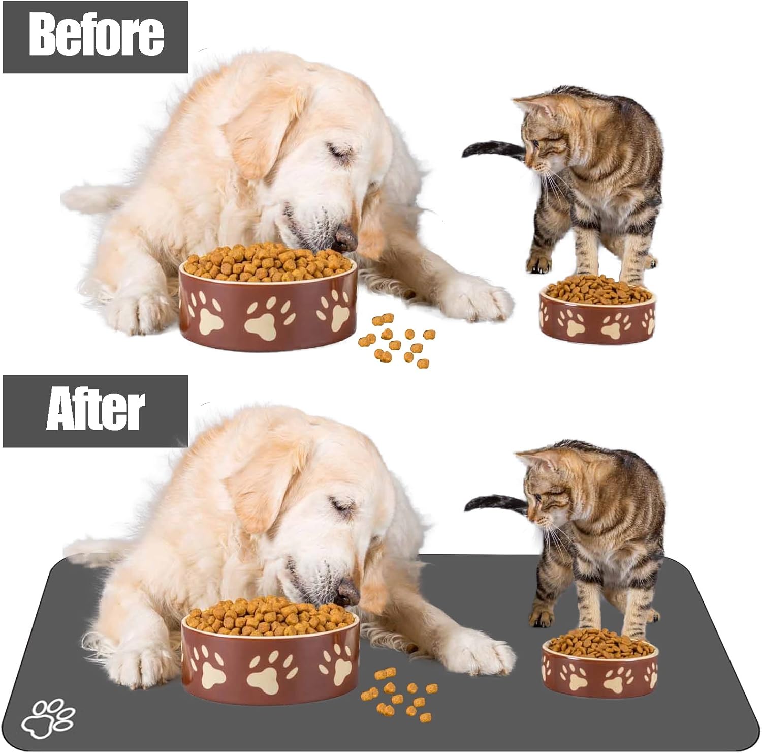 - Absorbent & No Stains: Perfect dog accessories.This dog food mat can stop water from overflowing. Super absorbent and quick-dry ability can avoid wetting pet paws even for messy drinkers. No marks will be left when food and water are dropped on the pet food mat. Good dog products to care your pet while reducing the times of cleanings.