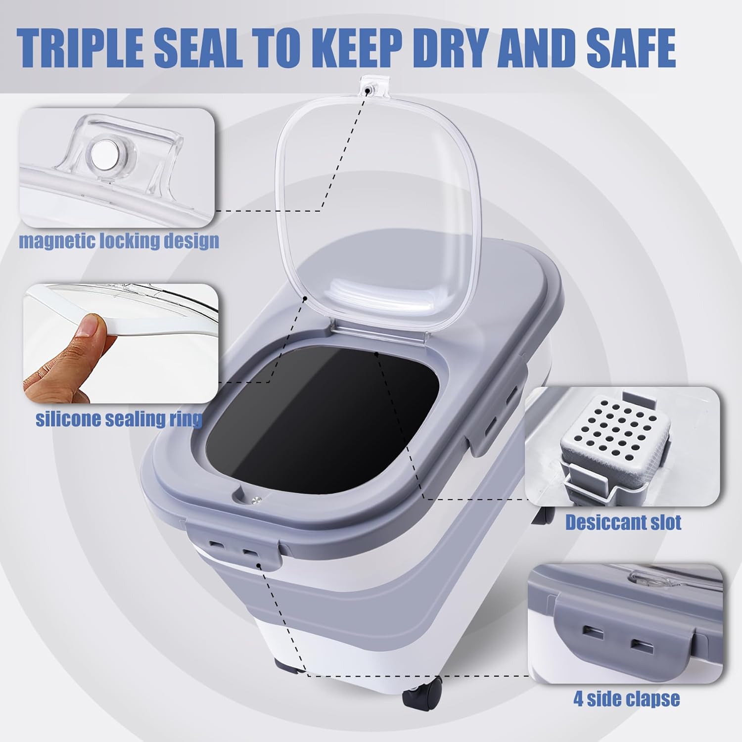 Collapsible Dog Food Storage Container, Airtight 30 35 Lbs Rice Cereal Flour Sugar Containers, Sealable Plastic 20 25 Pound Dog Pet Cat Bird Seed Kitchen Pantry Holder Bin Bucket with Rolling Wheel
