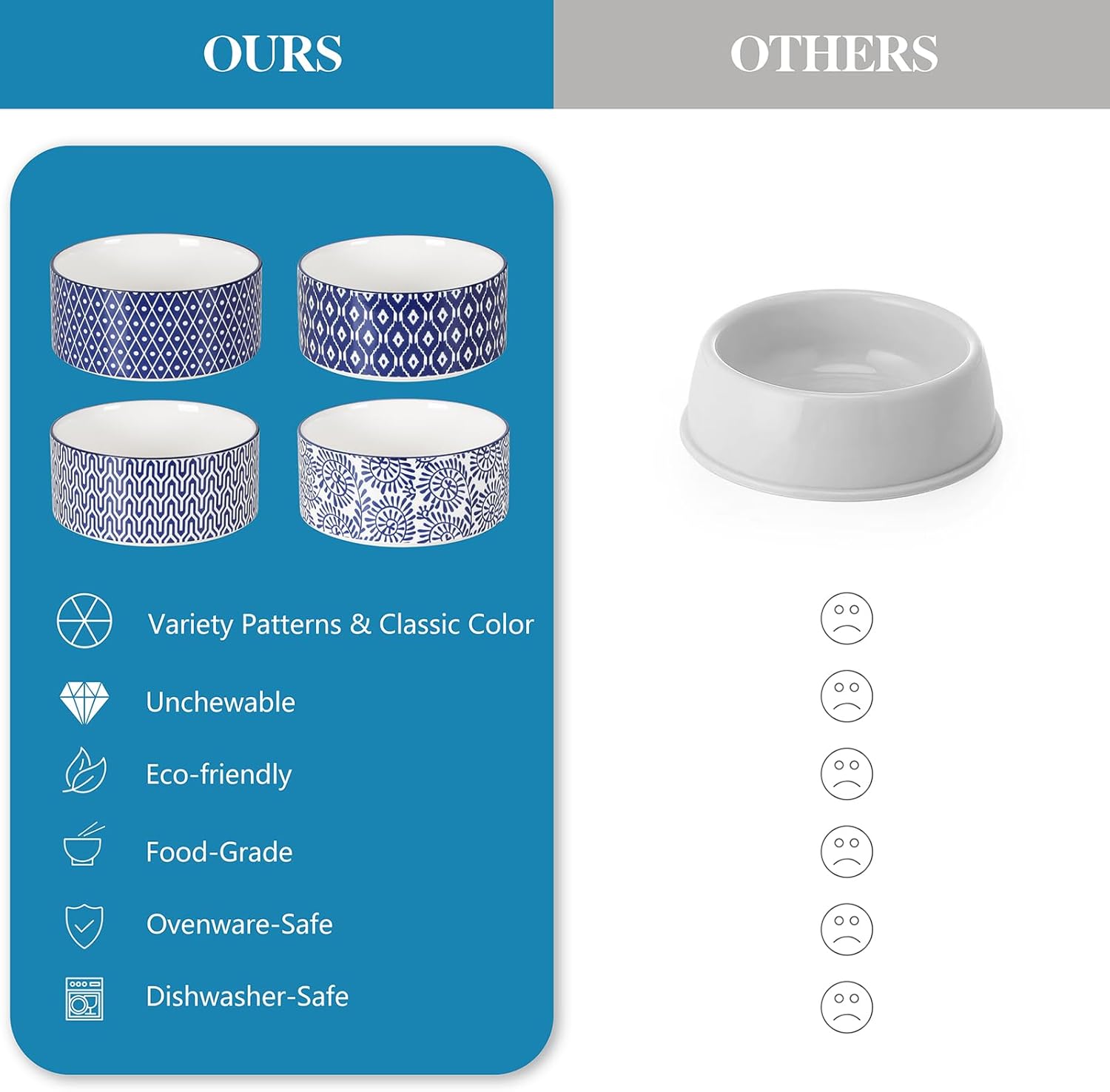 - DOUBLE BOWLS, DELICATE DESIGN - The thoughtful design of these double bowls offers convenience for your pets. You can use one bowl for food and another one for water, raising the dishes closer to your pet for more comfortable eating. Decorated with blue flowers and geometric patterns, these make them more unique that fit perfectly with any home decor style.