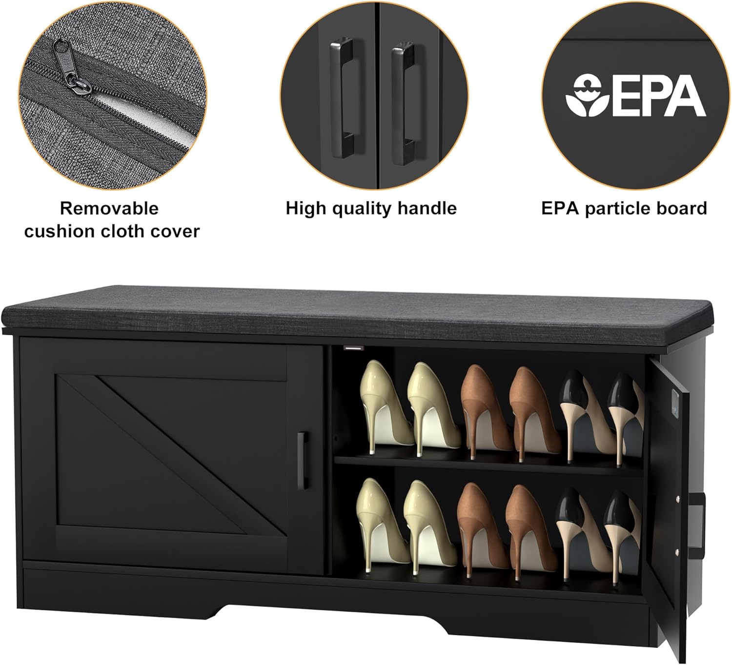 - Stable & Long-lasting: Made of EPA-Certified board, the product is stable with a static load of up to 300 lbs. The zipper design of cushion can help you remove and clean cover easily. What are you hesitating about? Now preparing a shoe bench for your home