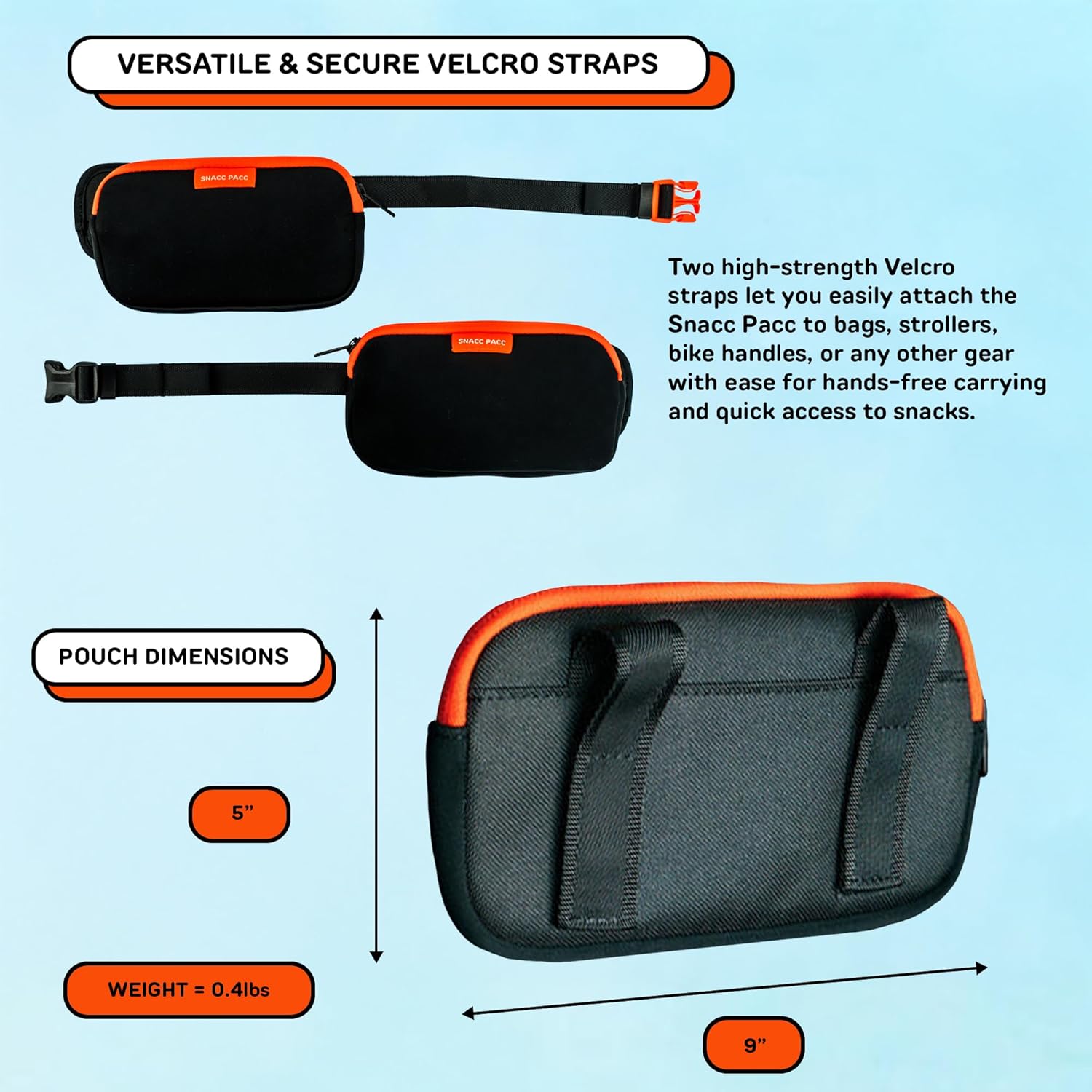 - TWO PREMIUM QUALITY POUCHES: The Snacc Pacc consists of two neoprene storage compartments. Each is equipped with Velcro strap backing.