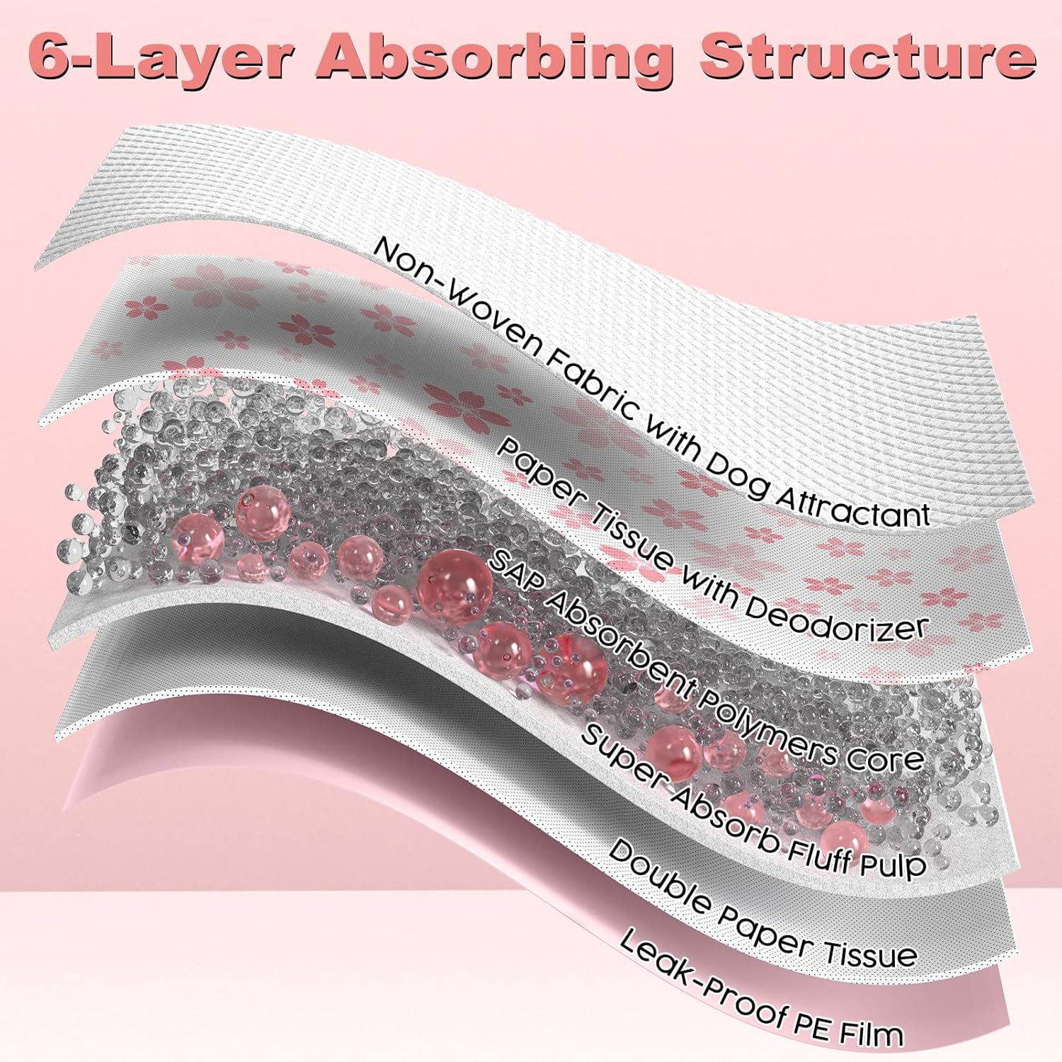 - Innovative 6-Layer Design: The paper part of this product comes from FSC-certified paper; Top non-woven fabric layer for quick absorption and fast drying; second paper tissue layer to absorb liquid; third layer of super absorbent polymer to turn liquid into gel; fourth layer of fluff pulp for extra moisture control; fifth layer of paper tissue for added protection; sixth layer of PE film to prevent leaks and protect floors