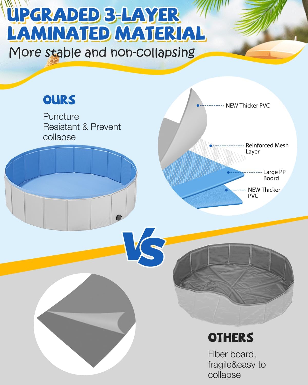 - UPGRADED THICHER MATERIAL: YSJILIDE Dog pools are made of super durable 3-layer laminated vinyl and polyester mesh to prevent outward collapse and resist punctures. The bottom is soft and flexible. Corners sealed well without leak.