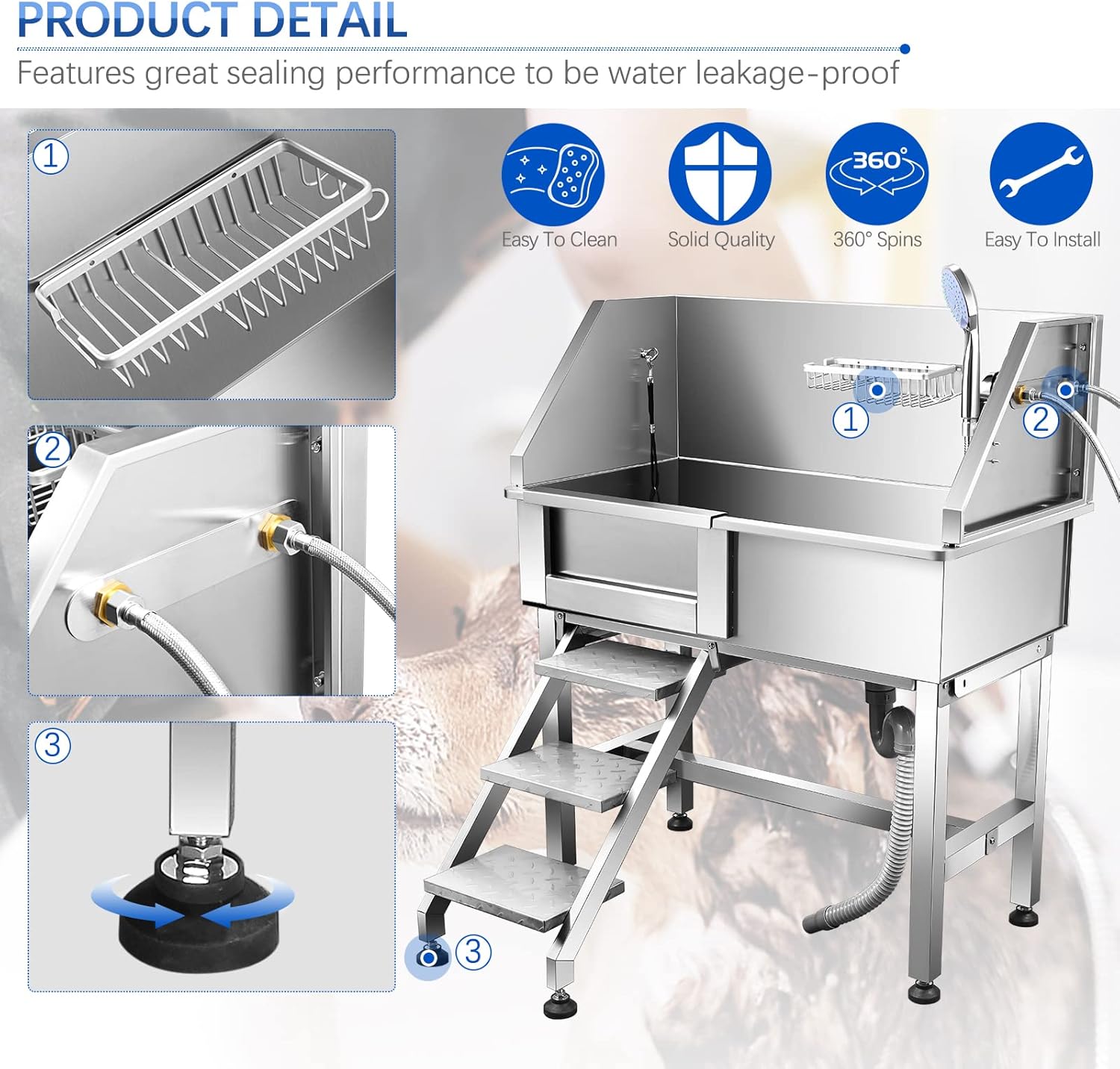 - Saving-Space Steps - The safety step ladder is convenient for pet dogs to get in and out of the bath smoothly. Dog grooming bathtub station with adjustable steps it is for easy entering, and can take back to the bottom of dog bathtub when not in use for saving your space