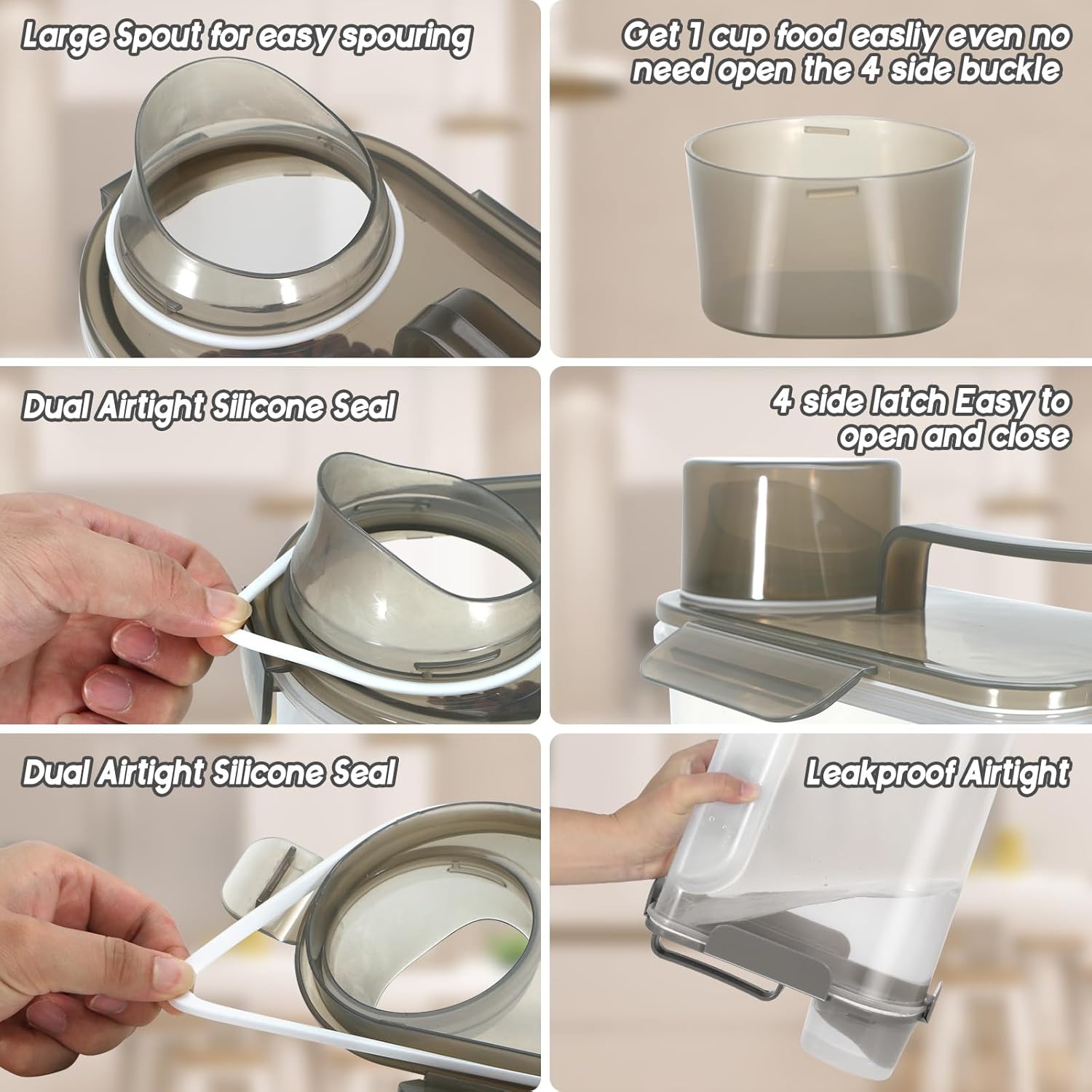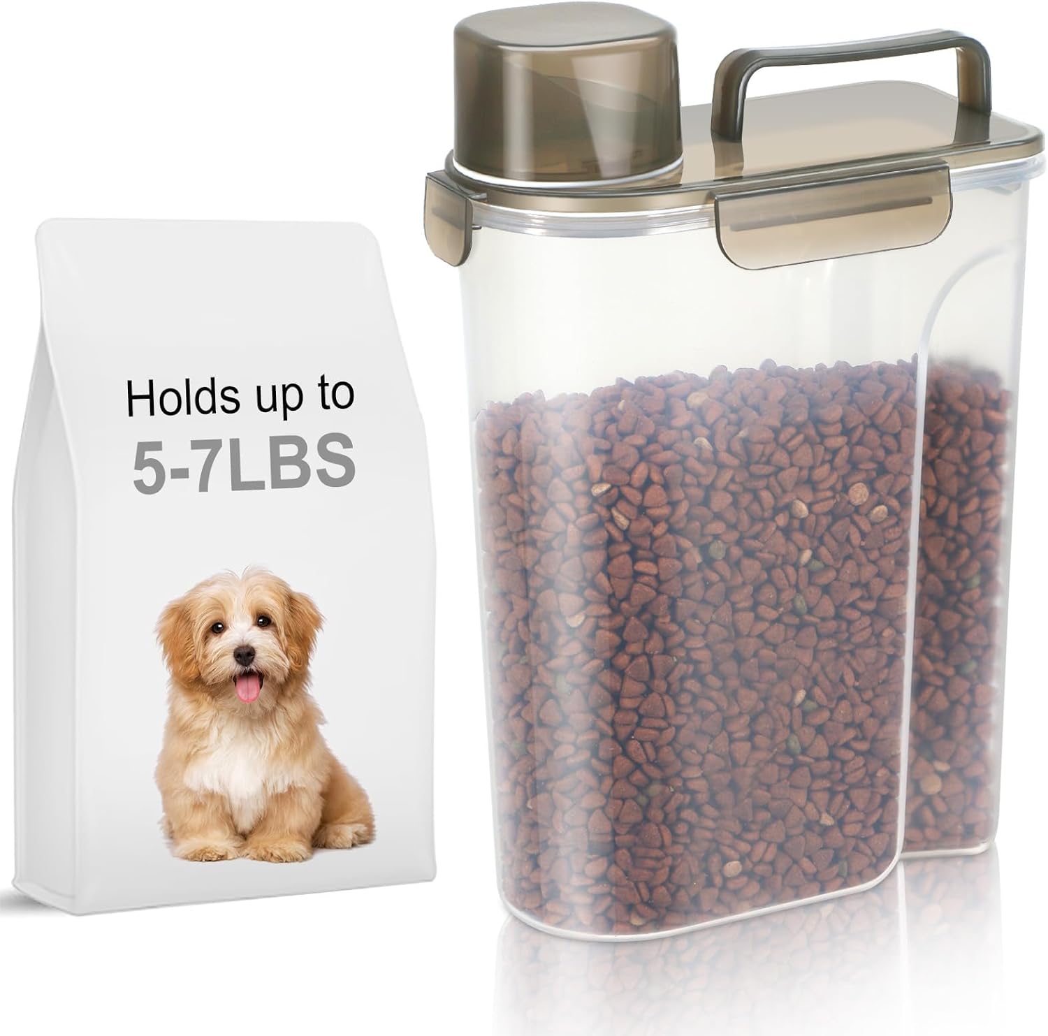 - WHAT YOU GET? The dog food storage container comes with a 1-pack airtight pet food storage container with a clear measuring cup and an upgraded large spout for easy pouring of pet food at any time. This dog food storage containers can be a gift The perfect gift for any home.