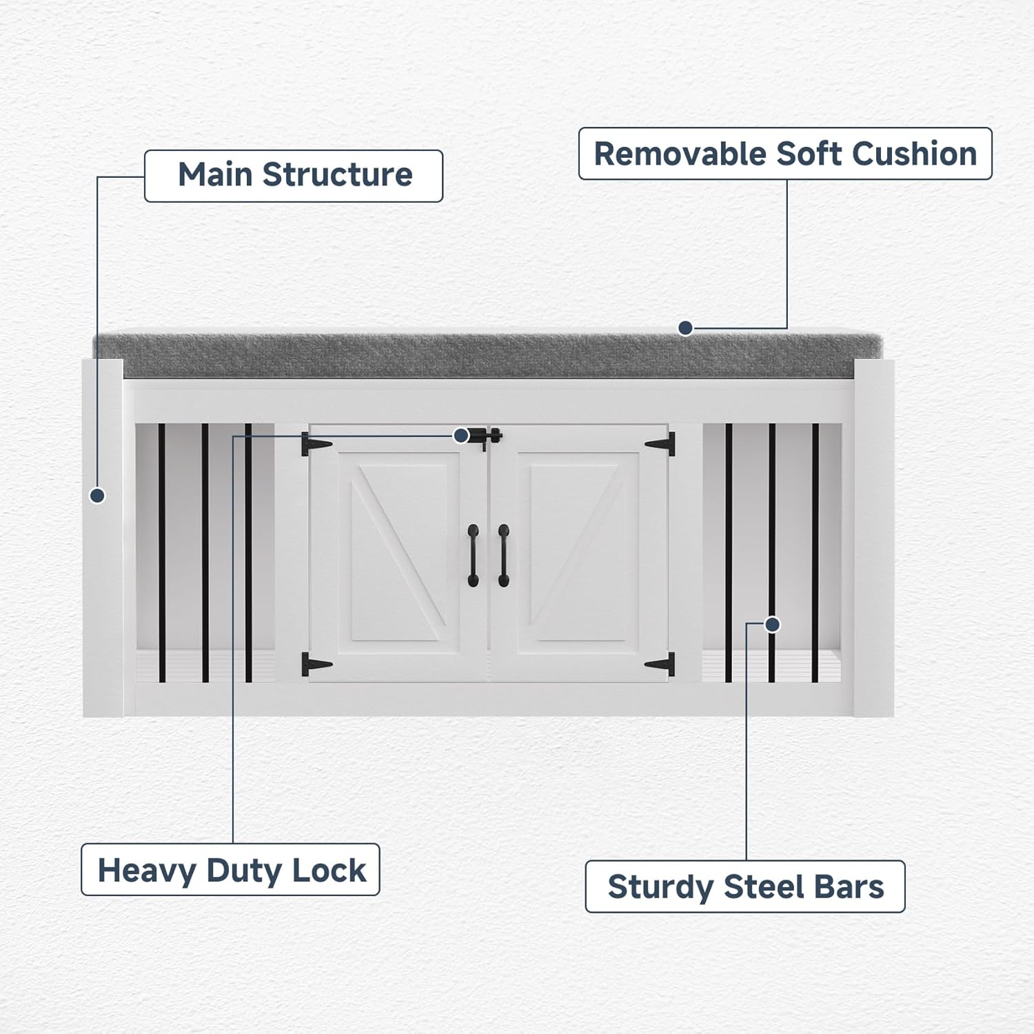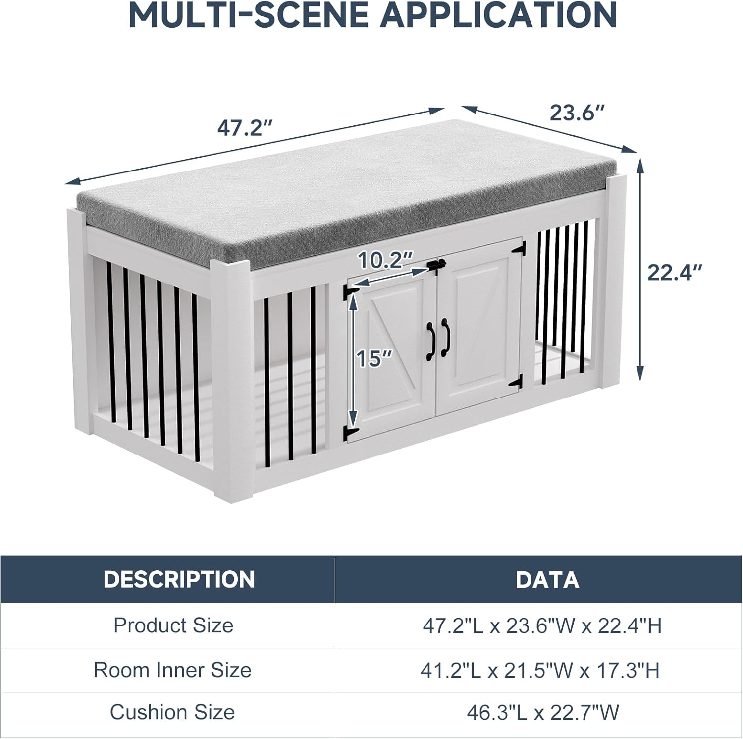 - EASY UPKEEP: This dog crate bench design focuses on your convenience. With a removable cushion and easily accessible doors, cleaning and maintenance are effortless, promoting a clean living space for your pet.