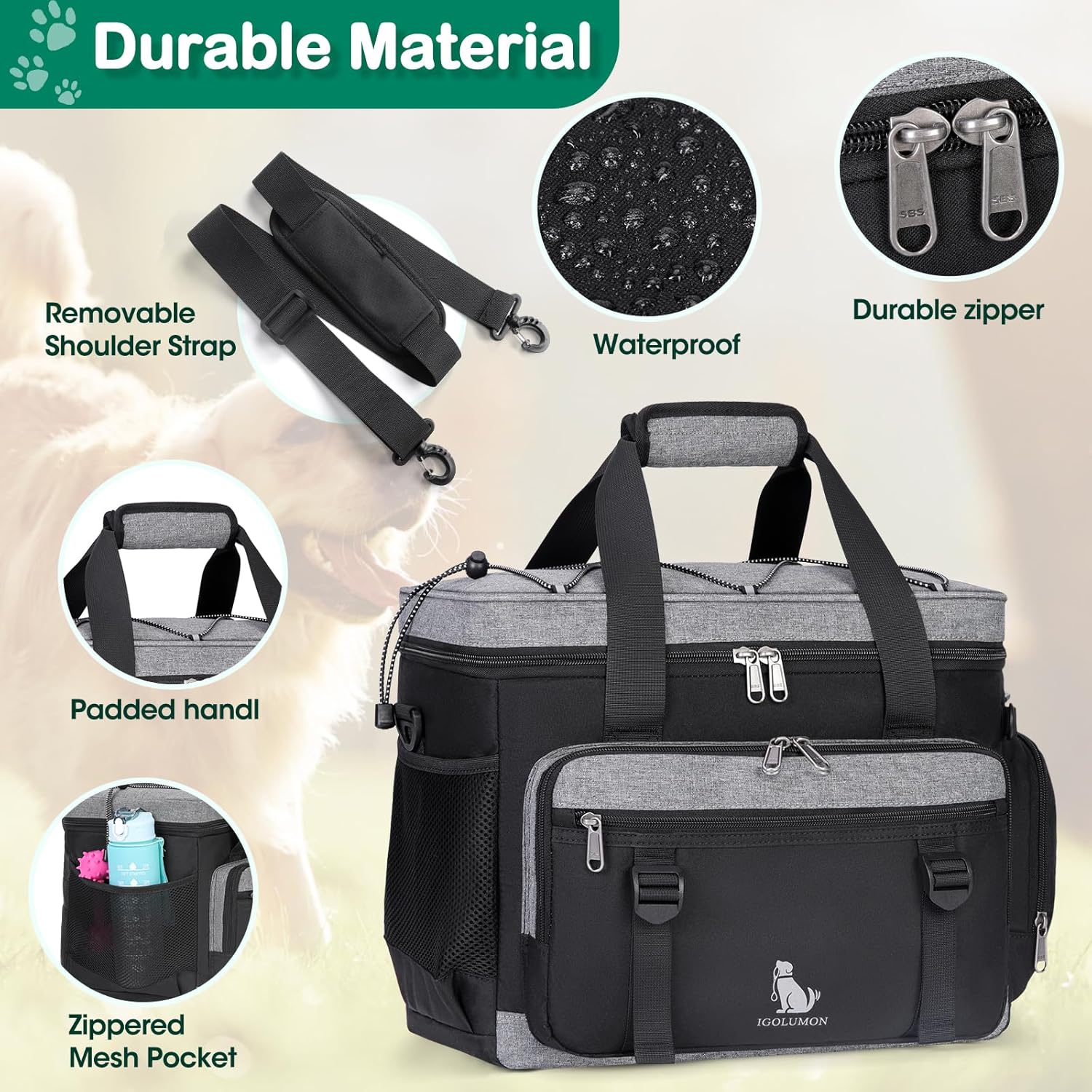 IGOLUMON Dog Travel Bag Large Pet Travel Bags Set for Supplies Weekend Travel Kit Tote Organizer Multi-Pockets Food Travel Bag with 2 Extra Large Food Containers, 2 Dog Bowls, 1 Feeding Mat
