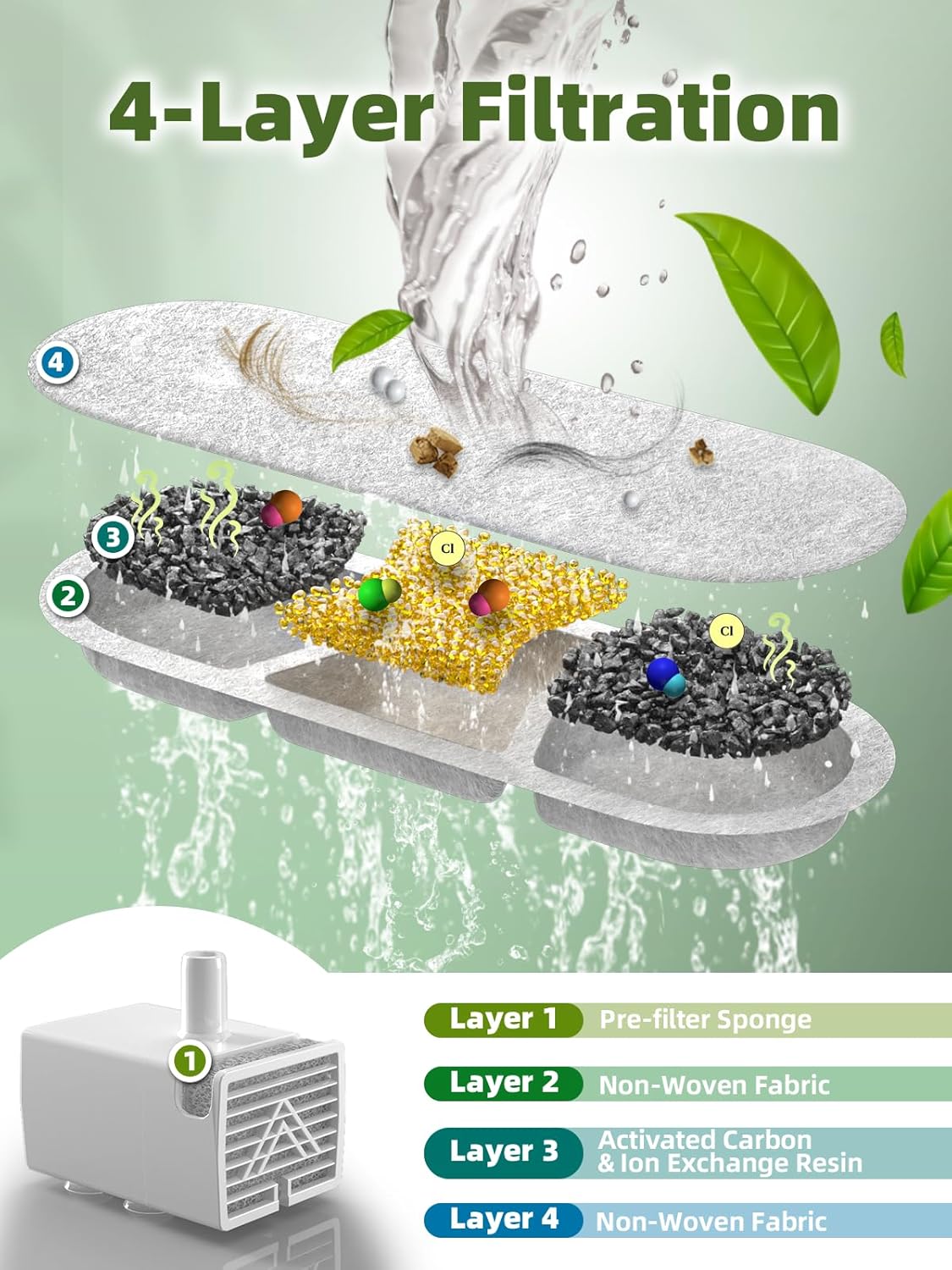 - 4-Layer Filtration System: The stainless steel pet fountain uses 4-layer filtration systems. The carbon filter consists of high-density filter cotton, activated carbon, and ion exchange resin, and there is a pre-filter sponge on the pump. They offer various purification functions, from trapping hair and small debris to softening hard water and filtering out invisible particles, providing pure and healthy water for your pet.