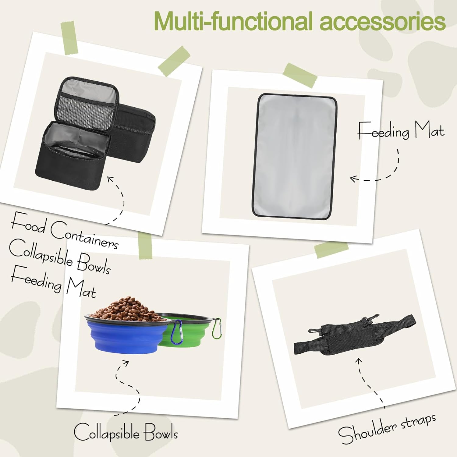 - 【Travel Bag For Dog Kit Include】: 1 Dog Tote bag, 2 Dog Food carriers bag, 1 Water-Resistant Placemat, 2 Pet Silicone collapsible bowls (The colors of the bowl are randomly matched). This dog travel tote bag is the ultimate food storage and supply gear for any trip.