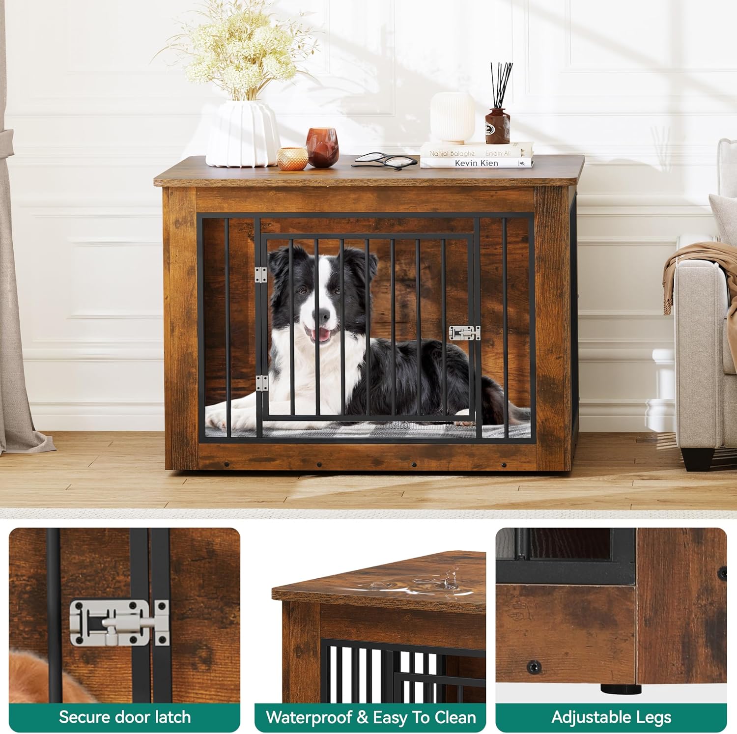 YITAHOME Dog Crate Furniture for Large Dogs, Side End Table, Modern Dogs Kennel Indoor up to 60 lb, 2-in-1 Iron-Wood Fusion Dog Cage with Waterproof Top, Safety Corners, Steel Lock,38"L, Rustic Brown