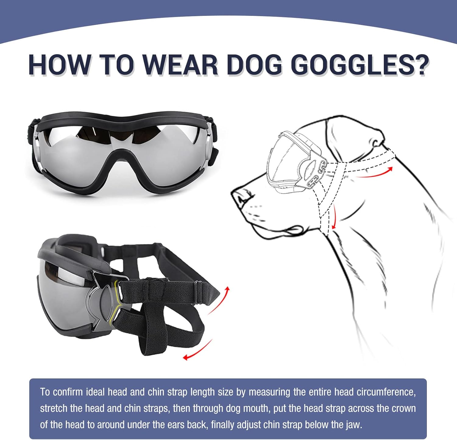 - Size Information: Head Elastic Straps: β€14", Chin Elastic Straps: β€9". (No Tensile Measurement). dog need take some getting used to in generally, you can distract with treats until he was used to wearing goggles.
