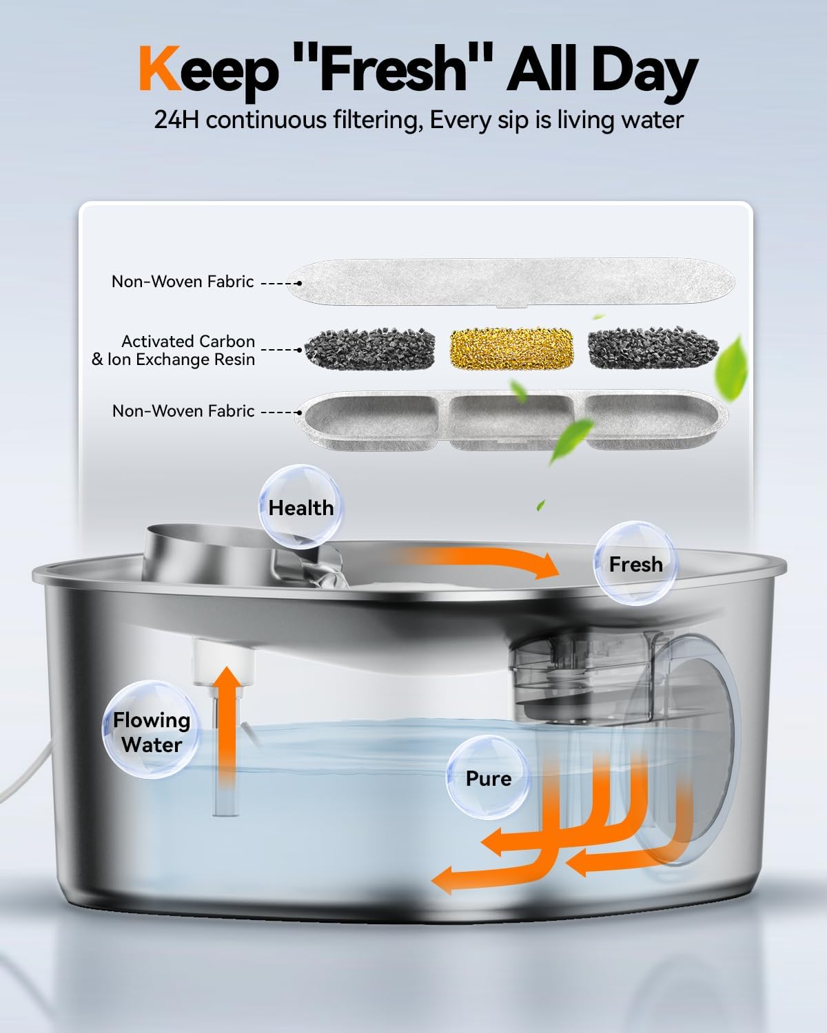 - 【 11L/2.8 Gal Large Capacity 】The Stainless Steel with the 11L large capacity makes it a perfect fit for all breed dogs cats and pets, reduces the frequency of refill for you while ensuring the daily water needs of your fur babies. The absolutely wide drinking area, encouraging your pets to be happy sharing water from all sides at the same time, and provide 500ml emergency water for your pets in case of power outages.