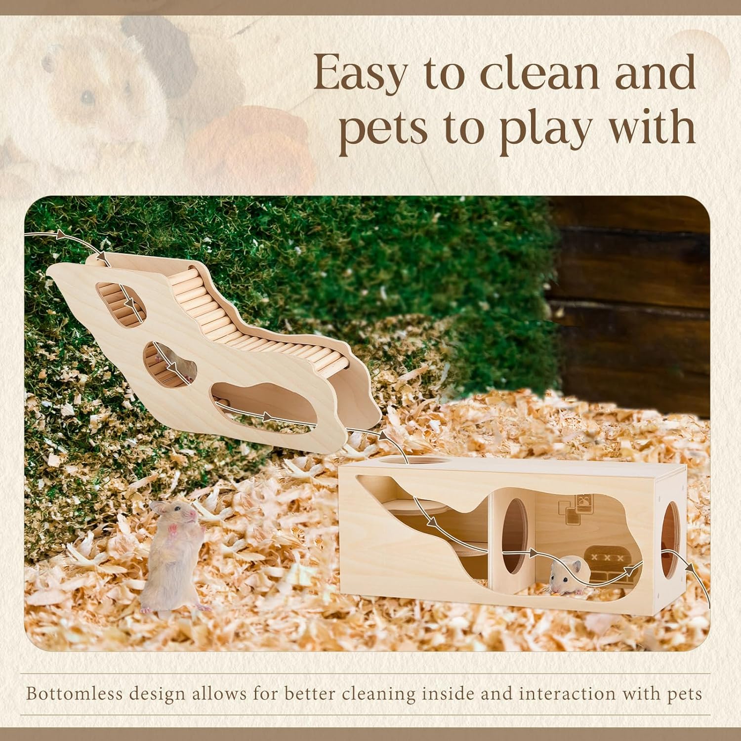 2 Pcs Hamster Houses and Hideouts Hamster Tunnel Set Wood House for Hamster with Climbing Ladder Exploring Tunnel Multi Chamber Maze for Small Animals Pets Gerbils Hedgehogs Rats Mice