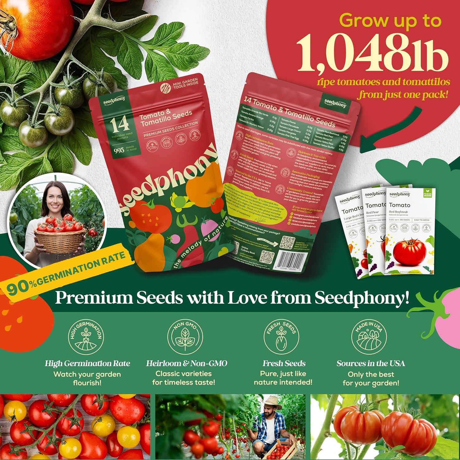 14 Tomatillo & Tomato Seeds for Planting Variety Pack - 990+ Non-GMO Heirloom Vegetable Seeds for Growing Tomato Indoor & Outdoor: Cape Gooseberry, Cherry, Flame, Roma, Beefsteak Tomatoes