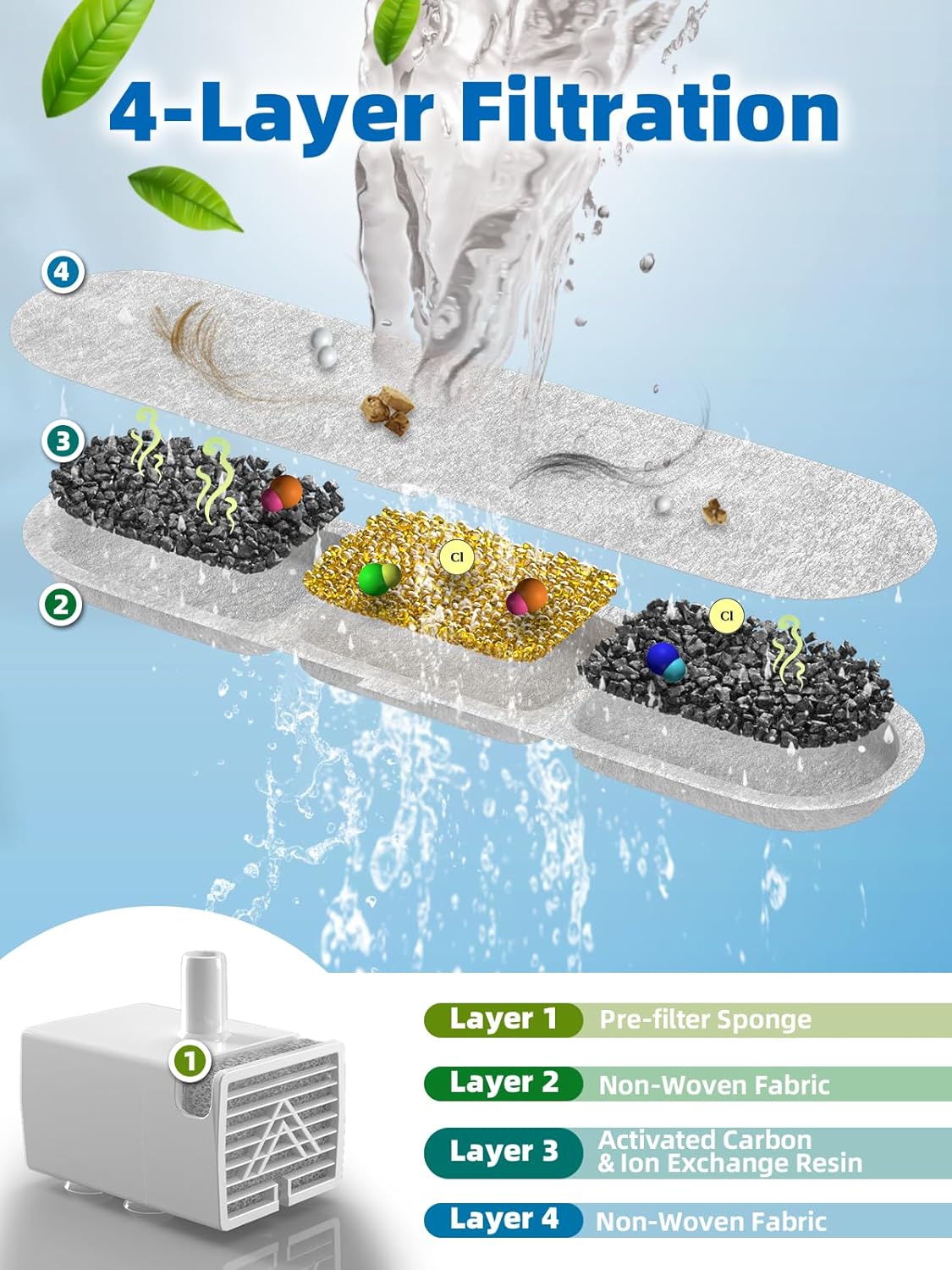 - 4-Layer Filtration System: The stainless steel pet fountain uses 4-layer filtration systems. The carbon filter consists of high-density filter cotton, activated carbon, and ion exchange resin, and there is a pre-filter sponge on the pump. They offer various purification functions, from trapping hair and small debris to softening hard water and filtering out invisible particles, providing pure and healthy water for your pet.