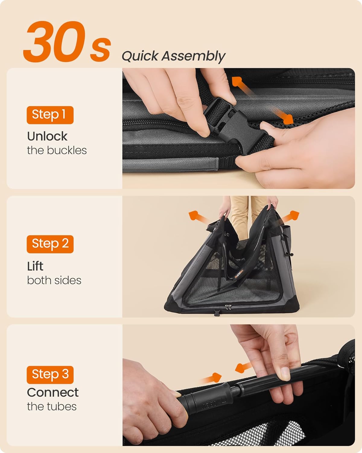 - 【STURDY & SAFE】Built with a robust steel frame and scratch- and tear-resistant Oxford fabric, the soft dog crate is designed for durability. Self-locking zippers ensure pets can't open it from the inside, and reflective strips add extra safety