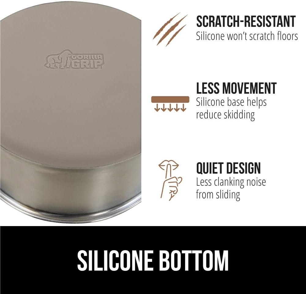 - SILICONE BOTTOM: the Gorilla Grip bowl is constructed from durable silicone that helps keep the bowl steady and wonβt scratch your floors; while some over eager eaters may still be able to slide the bowls, the silicone will help prevent much movement; plus, it reduces the noise from clanking and sliding across wood, tile, and more
