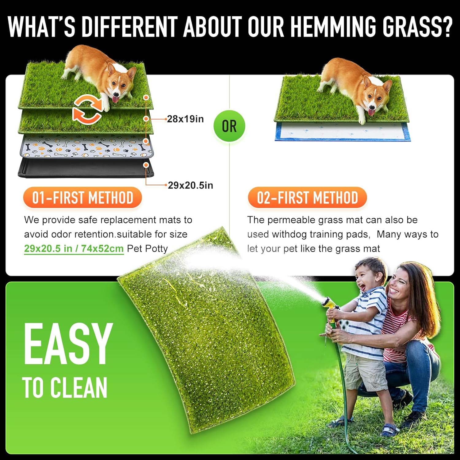- REPLACEMENT SET】: The size of the dog grass pad is 28"×19", compatible with Hompet's pet potty tray ( 29"×20.5" ), realistic turf makes it easier to train your puppies, All training pads are hemming designed in order to prevent the turf from falling or being torn by dogs, there is no need to worry the grass mat will falling off like the other dog grass pee pads on the market and can't be used.