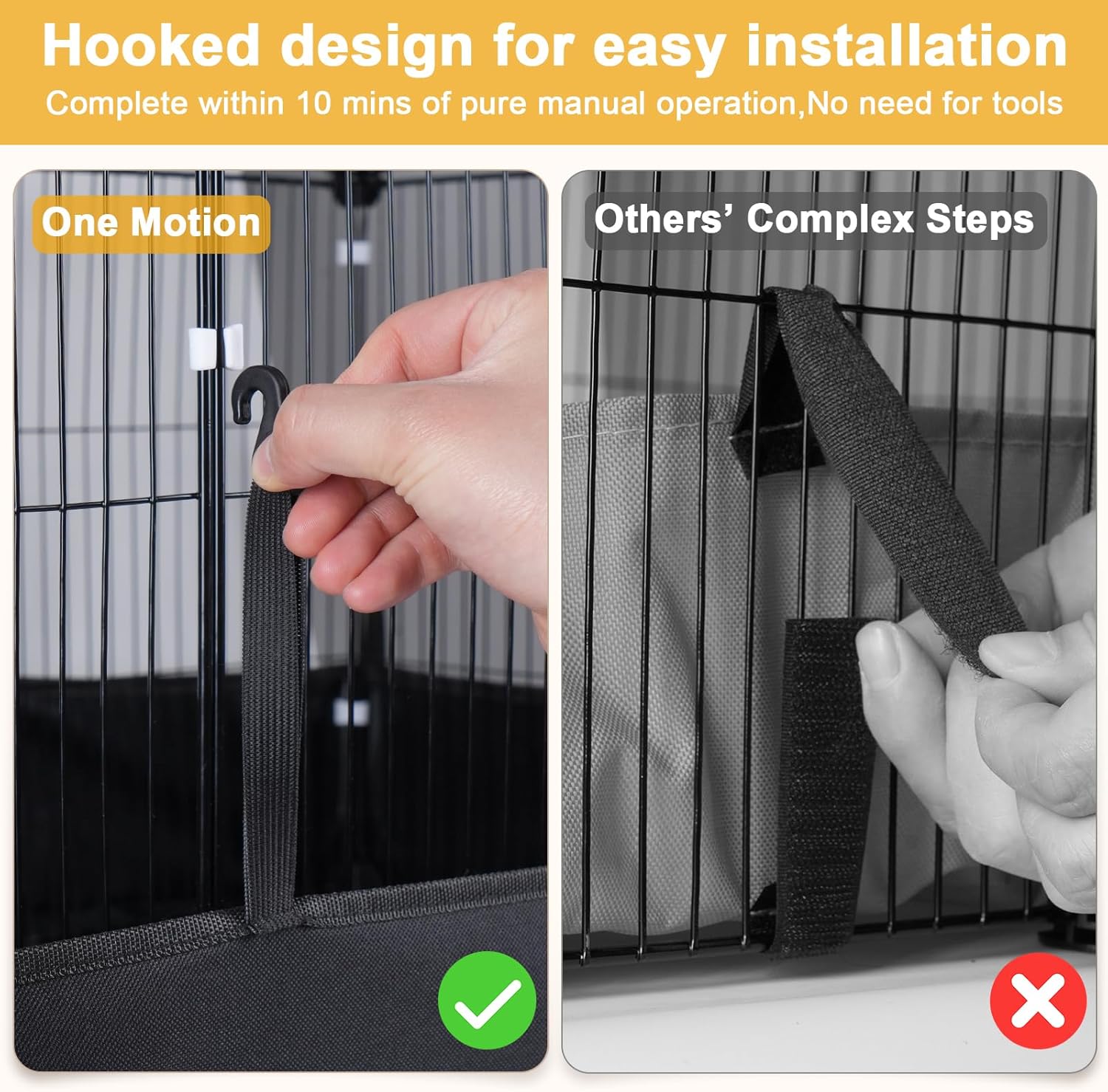 - Easy to Install: The installation of the guinea pig habitat is entirely manual and does not require tools. The one-motion hook design is more labor-saving than ordinary Velcro. It's more convenient to remove and clean/reinstall. When installing the guinea pig fence, you can use straps and buckles. After the fence is installed, you can turn the c&c grids upside down with the door facing down, place the liner on the guinea pig pen, and then turn it upside down to hang the hooks.