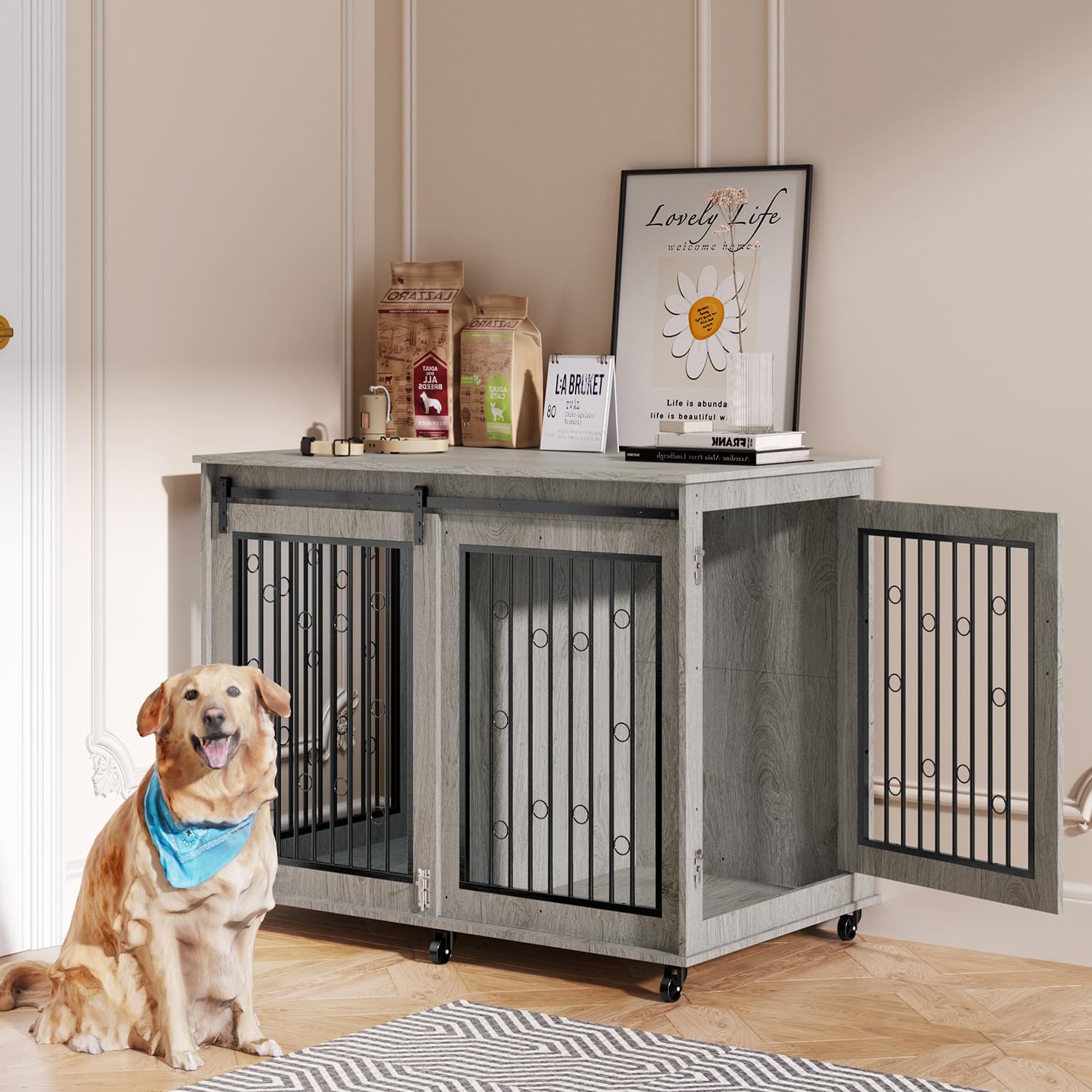 - 【Convenient Double-Door Access】Featuring a sliding barn-style door on the front and a side door, this indoor dog kennel allows for easy entry and exit. Ideal for active dogs that enjoy moving around freely.