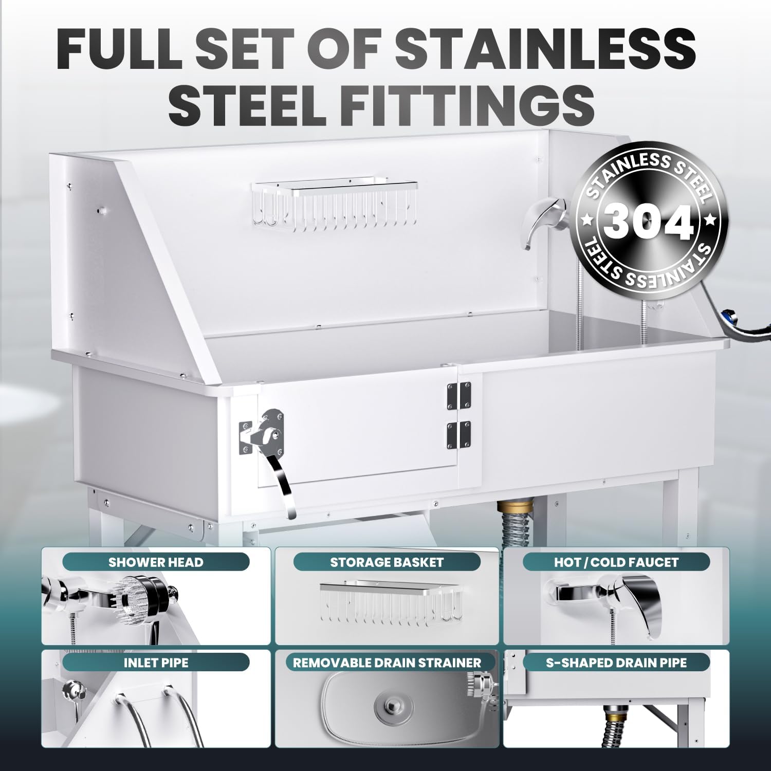 - Built to withstand up to 220 pounds, our dog washing station for home features a powerful drainage system. Whether indoors or outdoors, it fits seamlessly into utility rooms, garages, pet stores, and veterinary clinics. Versatile and durable, this dog grooming tub and dog bathing station are designed to provide a convenient and efficient bathing experience in various settings